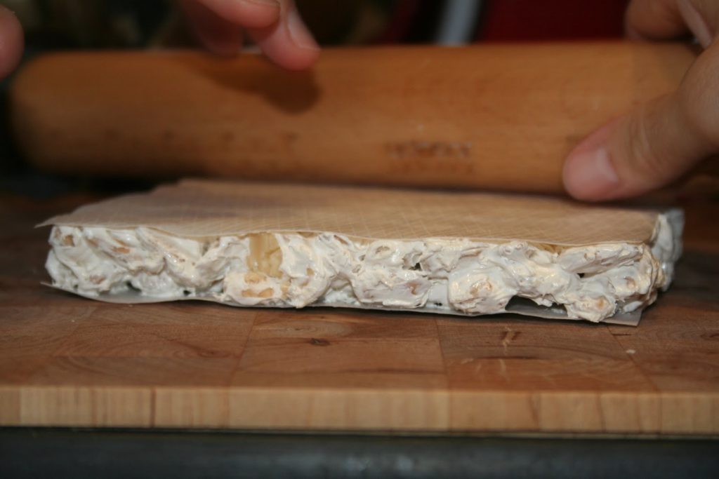 Puis aplanir au rouleau à pâtisserie pour uniformiser le tout. On peut retourner le touron pour égaliser les deux faces.