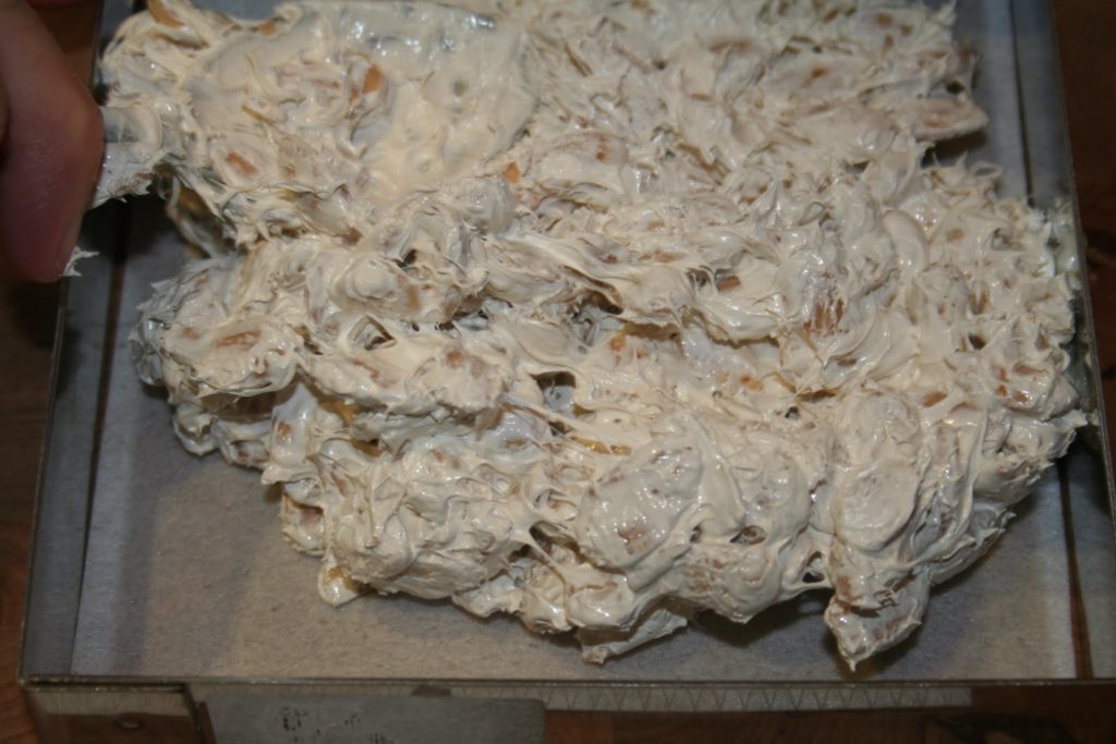 Et répartir le touron à la main (il n’est plus si chaud que cela!). On peut aplatir le tout assez facilement pour peu que ce soit fait rapidement.