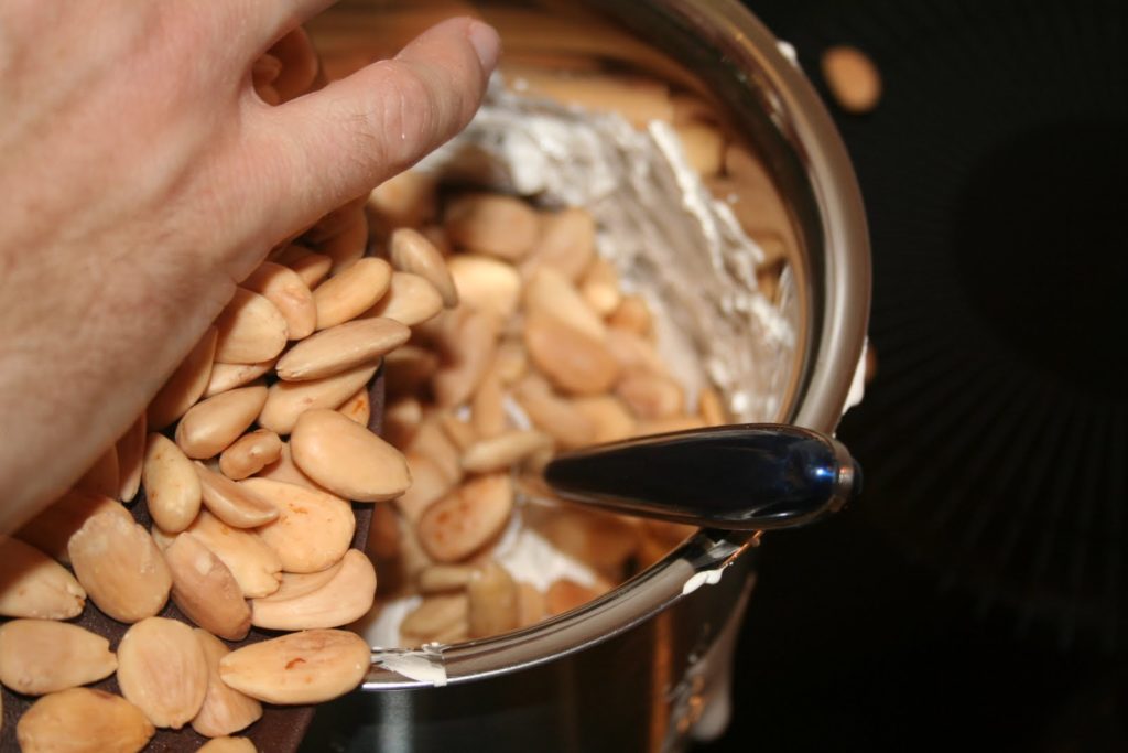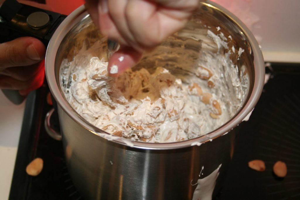 Quand le nougat devient dur dans de l’eau froide (on le voit car il devient difficile à mélanger au bout de 45 minutes), il est temps de jeter les amandes!