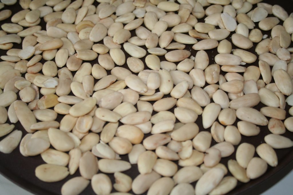 Les amandes doivent être chaudes quand on les ajoute dans la pâte de nougat. Sinon cela créerait un choc thermique et le touron durcirait instantanément!!