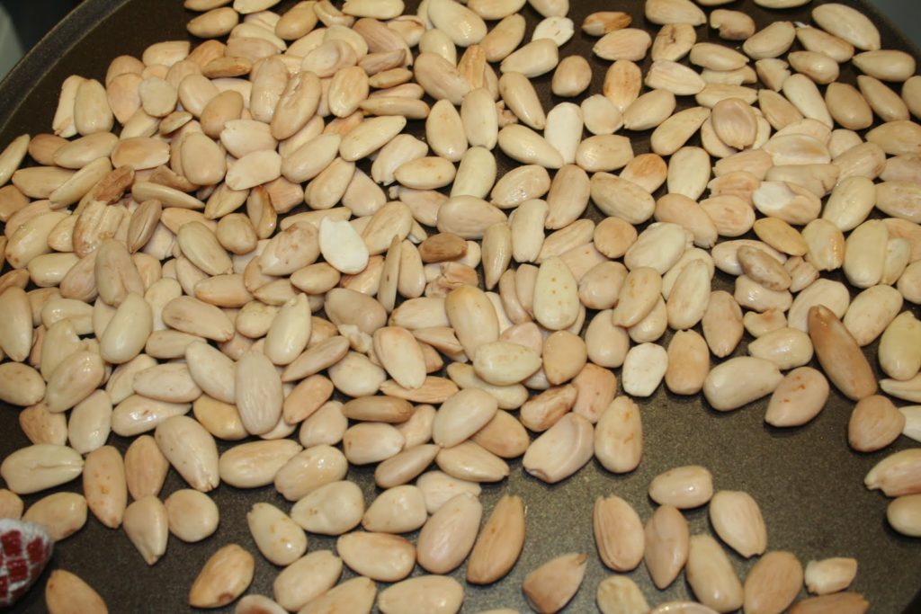- Surveiller (tout en continuant de mélanger le nougat!!) les amandes, les laisser cuire et dorer 10-12 minutes. Il faut qu’elles soient légèrement grillées. Les maintenir dans le four pour les garder au chaud.