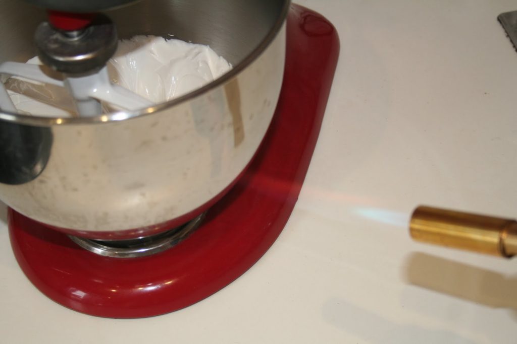 - Quand j’écris au début de la recette avoir essayé plusieurs méthodes, je montre ici une de mes expériences ratées! Dans certaine recette, ils disent qu’il faut assécher le nougat dans une cuve avec un chalumeau. J’ai donc bien entendu essayé… L’effet est joli sur la photo, mais tout a absolument brûlé dans la cuve!! Même en contrôlant le degré de la flamme!! Je déconseille donc vivement cette méthode!! Le bain-marie a été la seule solution efficace…