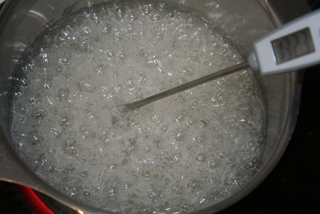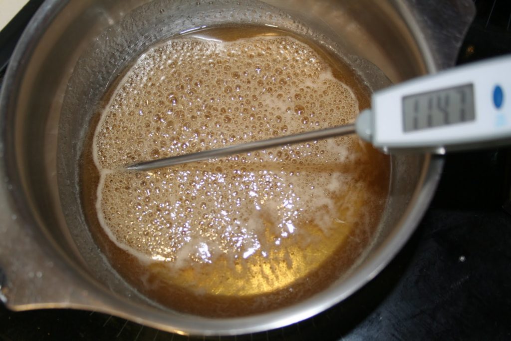 - Mettre le miel à cuire sur feu doux dans une petite casserole. Il faut en fait éliminer le plus possible l’eau du contenue dans le miel. Il faut porter celui-ci à 121°C mais en prenant son temps!!