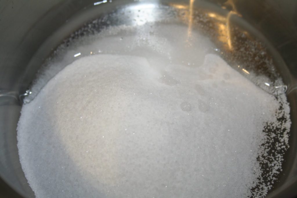 - Pendant ce temps, dans une autre casserole, mettre le sucre 2 (85g), le sirop de glucose et les 40g d’eau sur feu doux. Il faudra porter ce mélange à 150°C, au grand cassé.