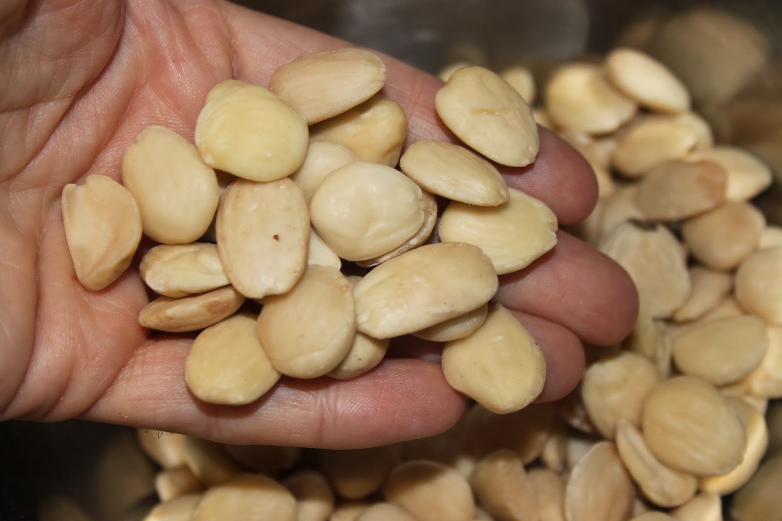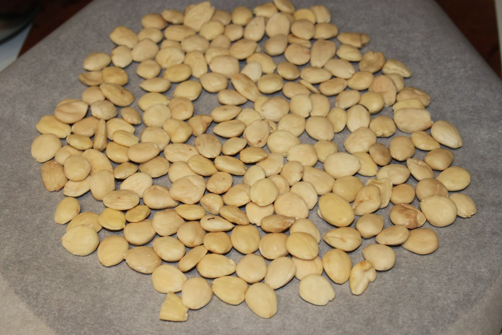 - Placez le cadre rectangulaire de 9X23cm (ou un autre format de superficie équivalente) sur une feuille de pain azyme, côté strié vers le bas. N’oubliez pas de graisser l’intérieur du cadre pour permettre le démoulage du turron ! Pour la superficie du cadre, le mien fait 207 cm carrés (9×23). Si vous avez un cadre carré de 14 ou 15 cm de côté, cela fera parfaitement l’affaire. Sinon, multipliez les côtés de votre cadre pour connaitre sa superficie et faites une règle de trois pour avoir un coefficient multiplicateur. Explication: si vous avez par exemple un cadre de 20X20, cela fera 400cm carrés de superficie, le mien 207 (on peut arrondir à 200), donc en gros il faudra multiplier par deux les ingrédients. C’est clair pour tout le monde? ? Si vous un cadre de 5X10, il faudra en revanche diviser par 4 ! Voici les belles amandes que j’ai achetées dans un marché de Barcelone.
