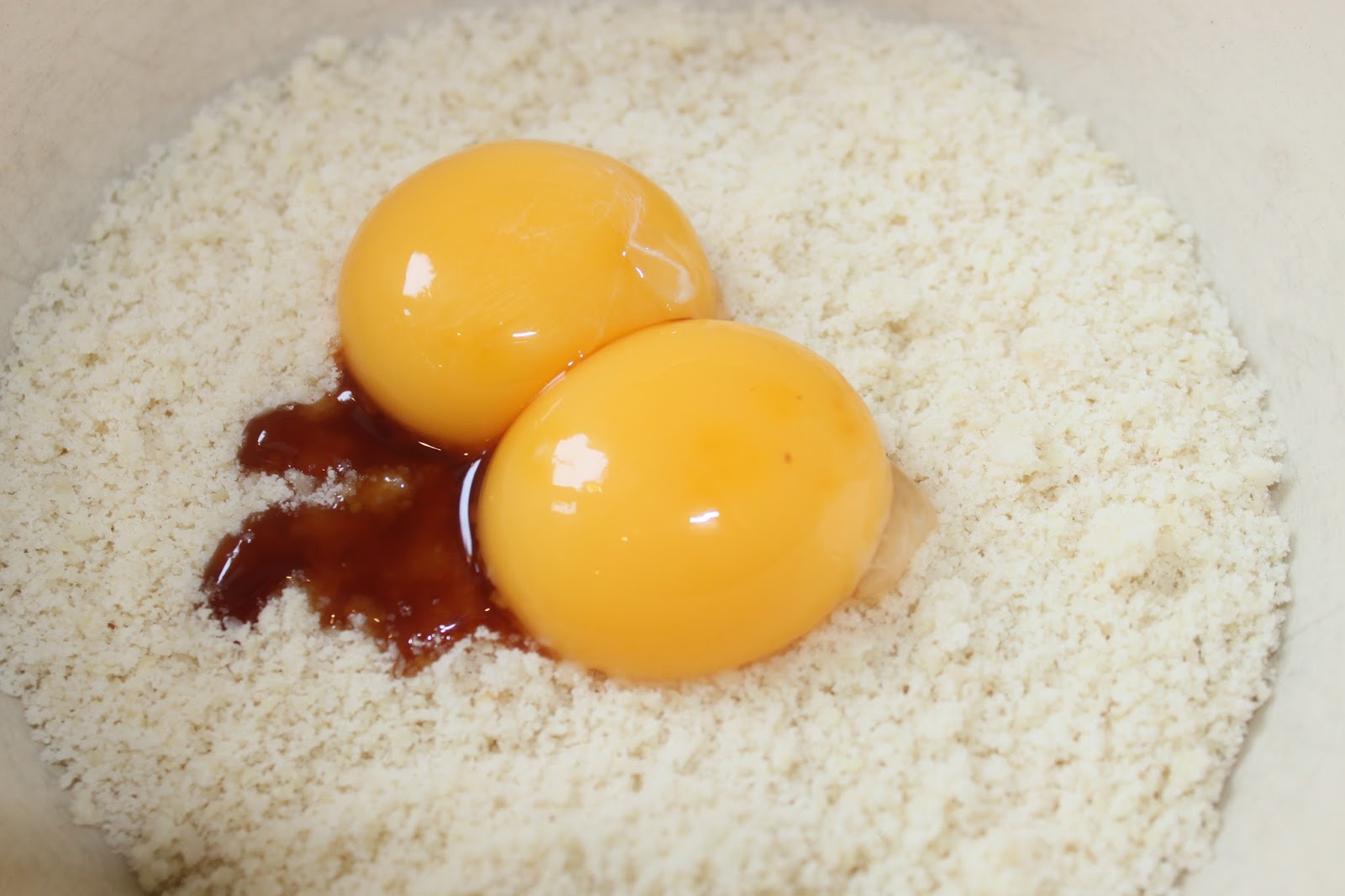 Pendant ce temps, dans un bol, mélangez la poudre d’amande, les jaunes (sur la photo il y en a deux, mais j’en ai ajouté un plus tard) et l’extrait de vanille.