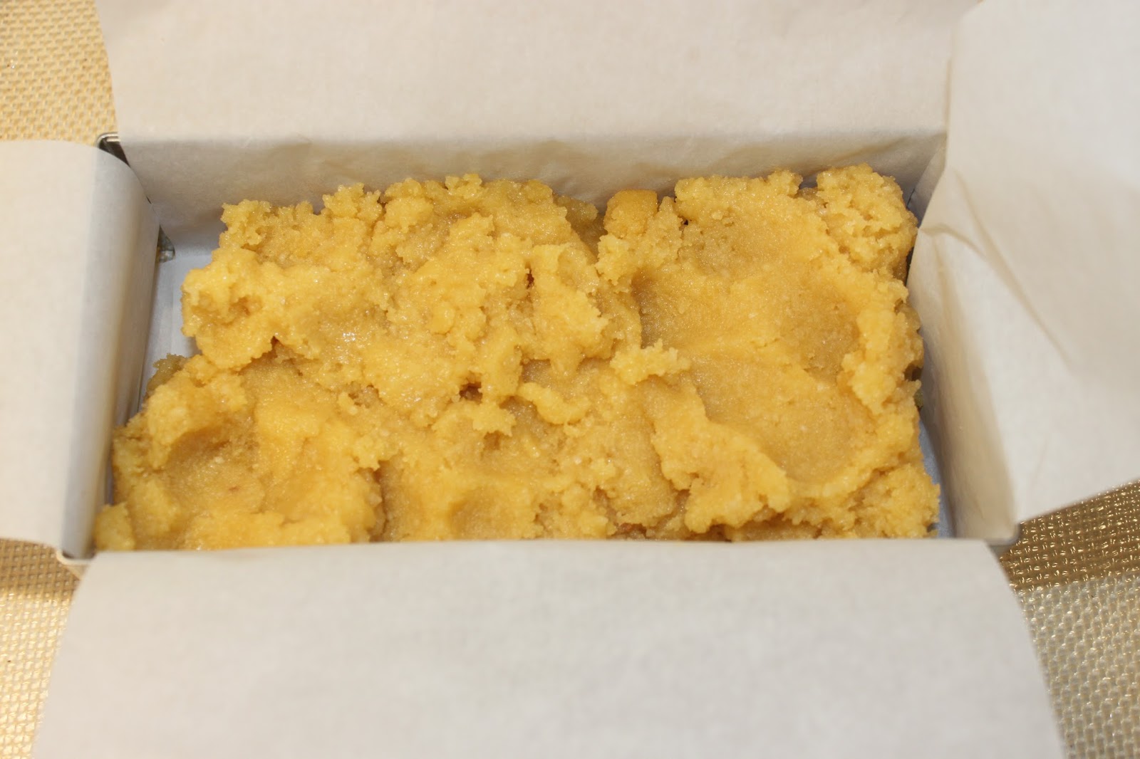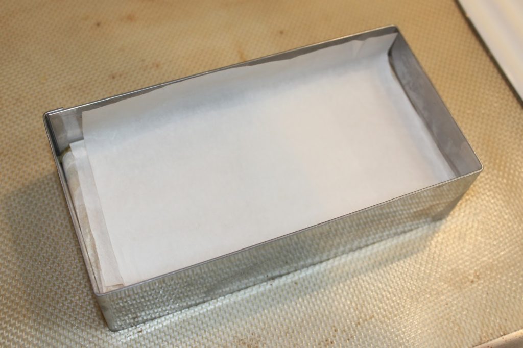 - Préparez un cadre de 8X16 cm. Mettez une feuille de papier sulfurisé dans un sens, et une autre en perpendiculaire. Il faut que le papier dépasse bien. Posez le tout sur un tapis de cuisson sur une plaque. Versez l’intégralité de la pâte d’amande dans le cadre chemisé. Étalez le plus uniformément possible.