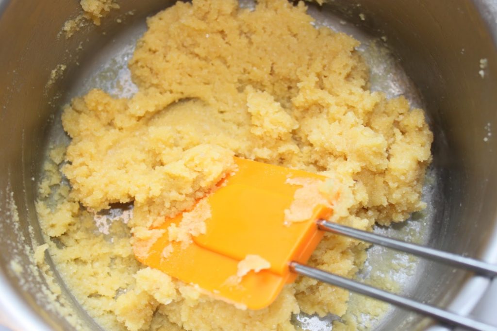 - Comme il y a peu de sirop, il faut bien tout récupérer. Pour cela j’ai reversé (hors du feu bien entendu) la pâte dans la casserole pour bien racler le sirop et l’incorporer.