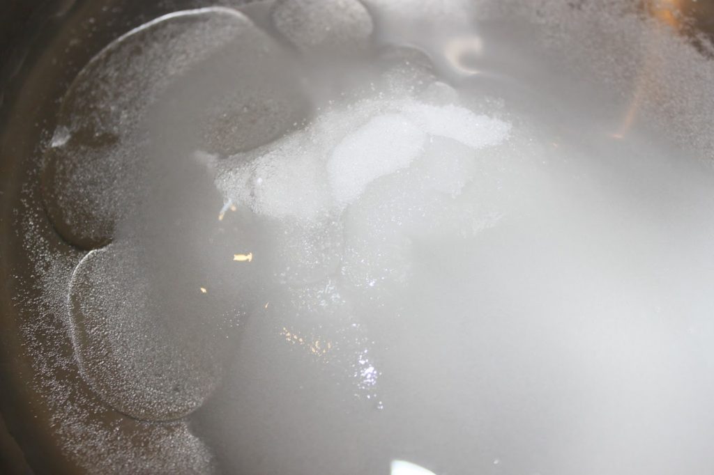 Versez le sucre, le sirop de glucose (qui évitera la recristallisation du sucre) et un peu d’eau dans une petite casserole. Il en faut juste assez pour imbiber le sucre. Faites chauffer sur feu doux.