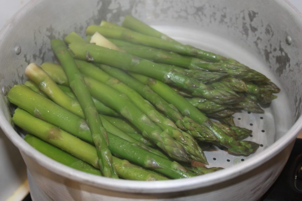 - Quand le bouillon a cuit trois heures, mettre les asperges à cuire à la vapeur pendant 9 minutes au dessus du bouillon. De cette façon, le jus des asperges va retomber dans le bouillon.