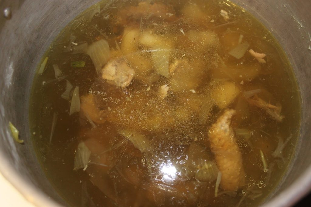 - Préparer un bouillon maison. Pour cela, mettre deux litres d’eau avec les oignons coupés, une carcasse d’un poulet (avec la peau c’est bon aussi!) qui aura été bien décortiqué et mangé au passage, un cube de bouillon, les carottes et le céleri coupés en morceaux. Saler et poivrer. Porter à ébullition puis laisser cuire trois heures.