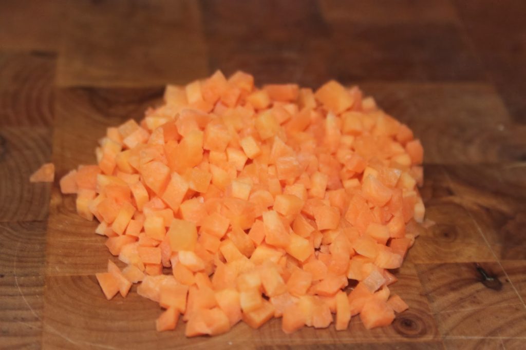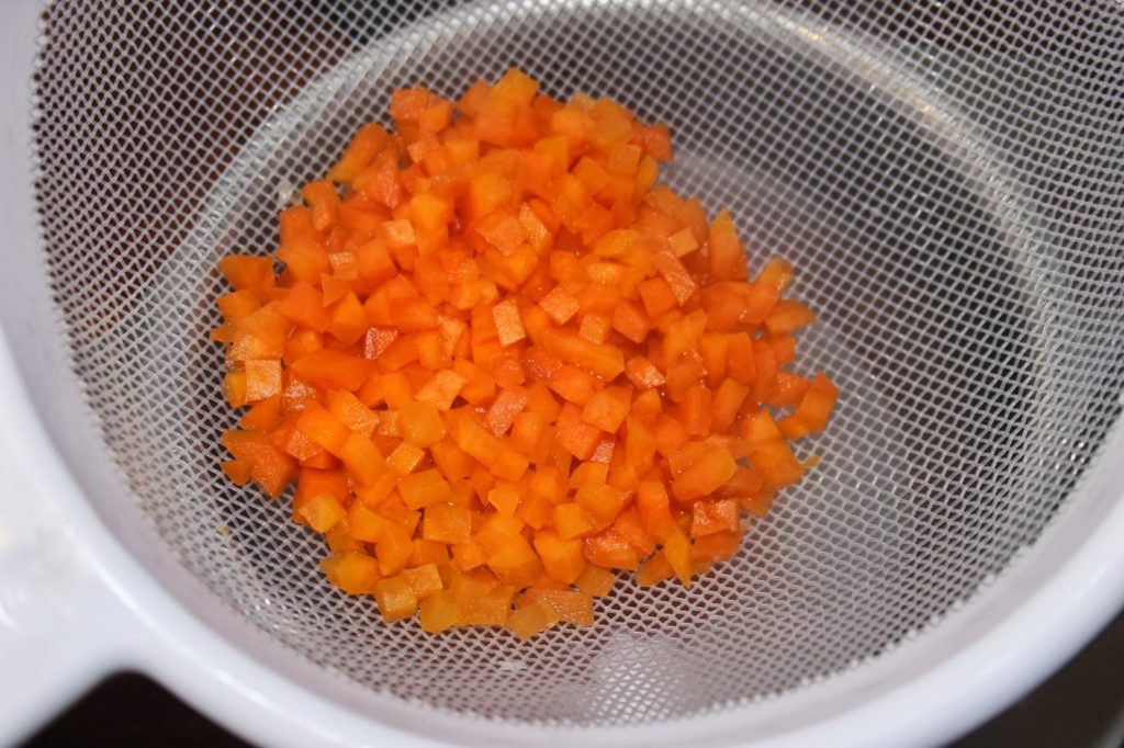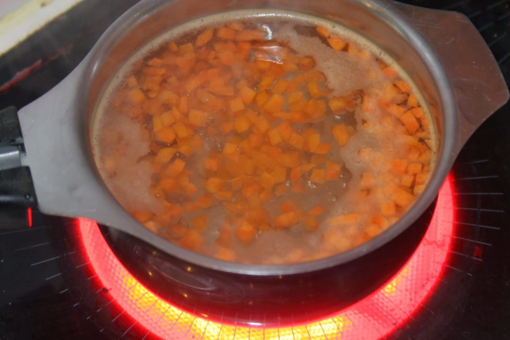 - Faites bouillir une petite casserole d’eau salée puis ajoutez les cubes de carottes.