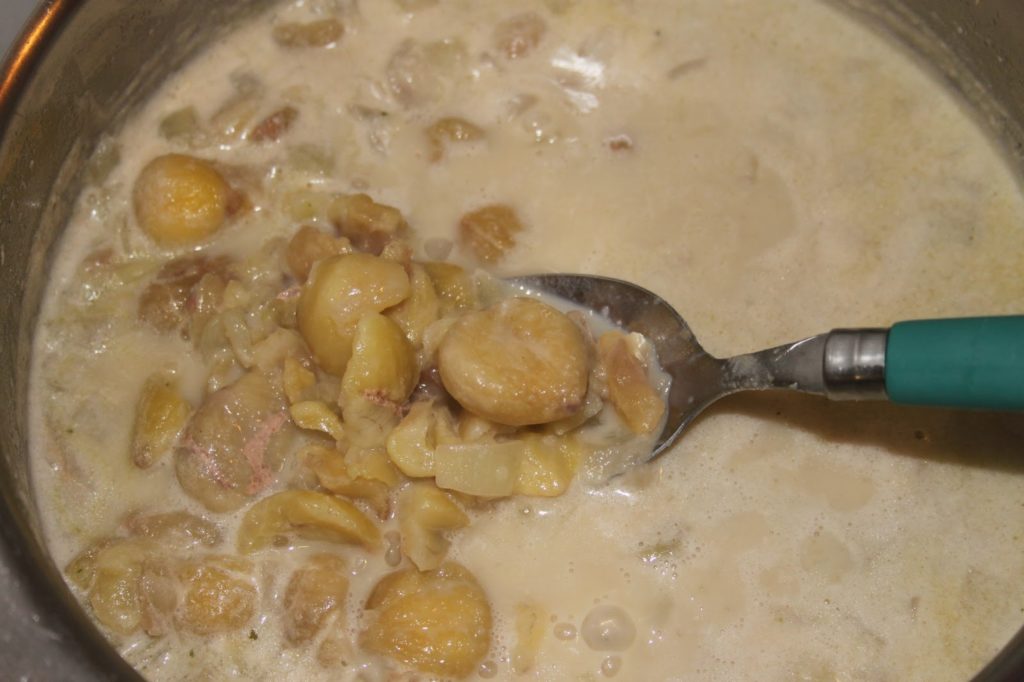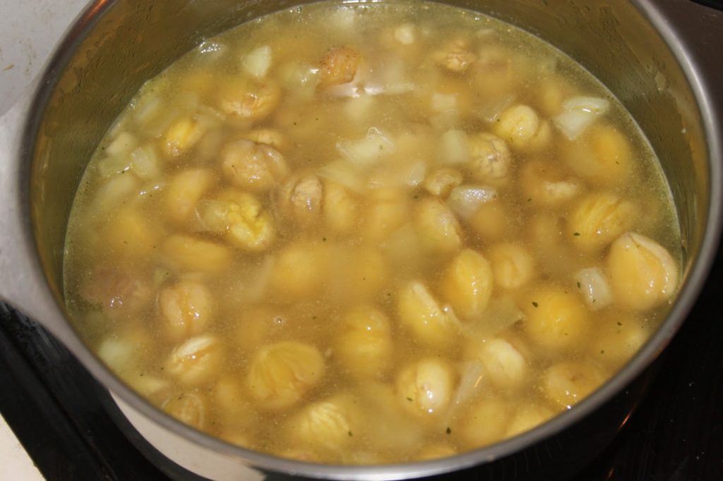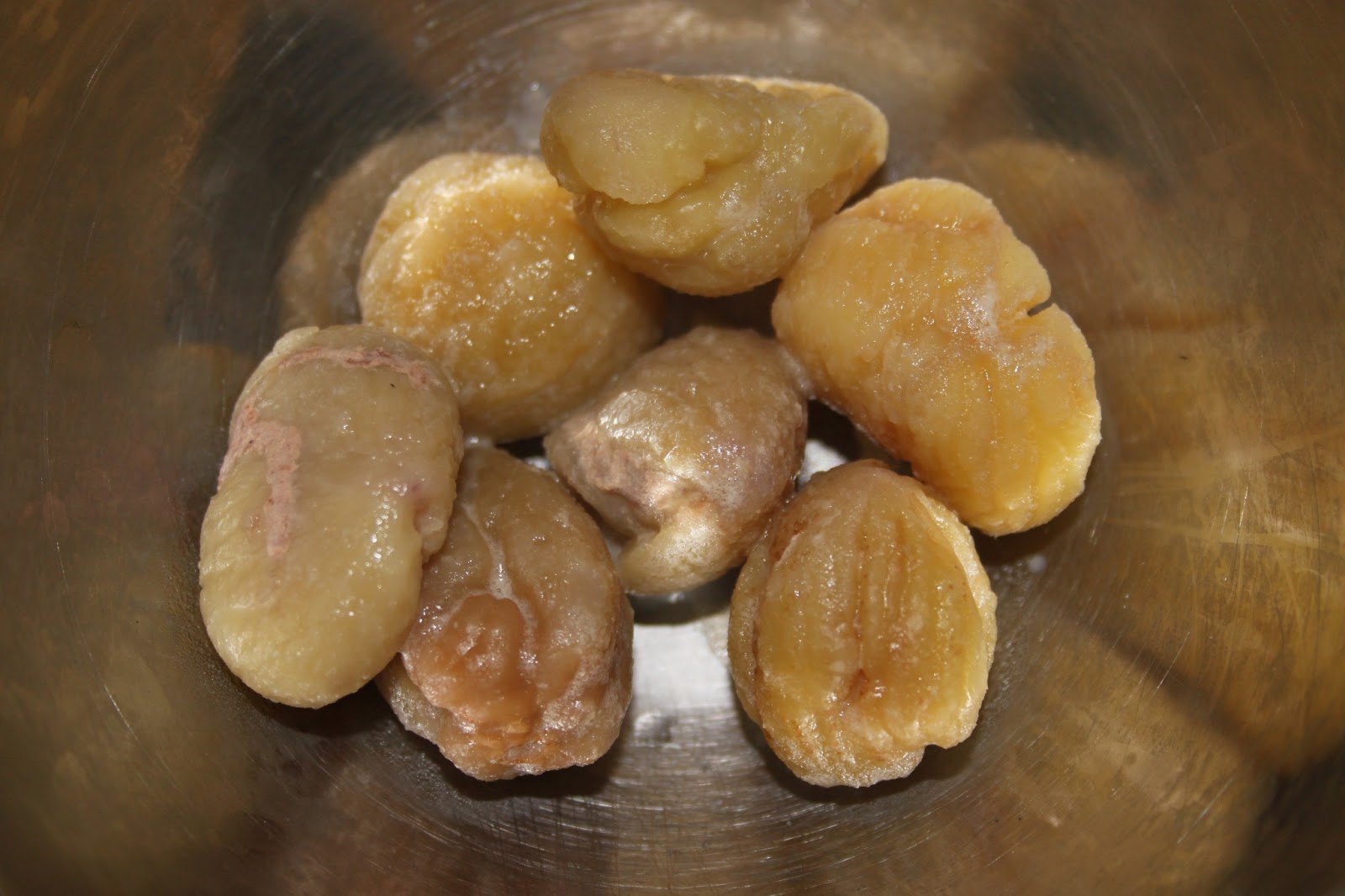 - Au bout du temps adéquat de cuisson, prélever 6-7 châtaignes qui auront résisté à la cuisson et qui seront restées assez jolies.