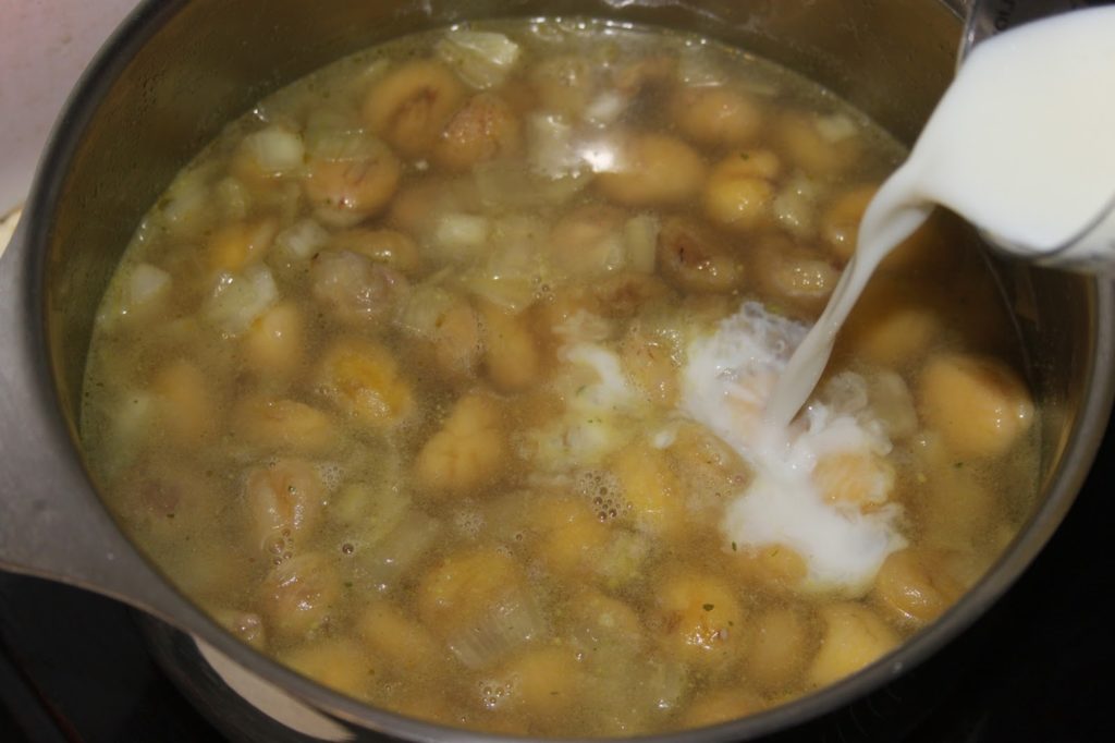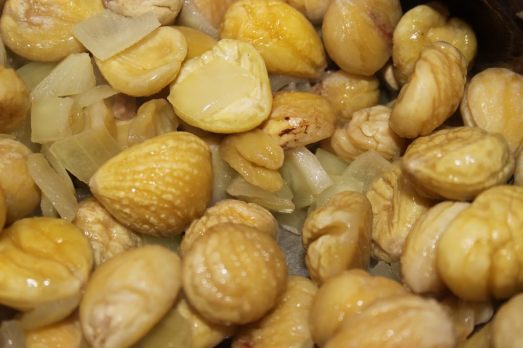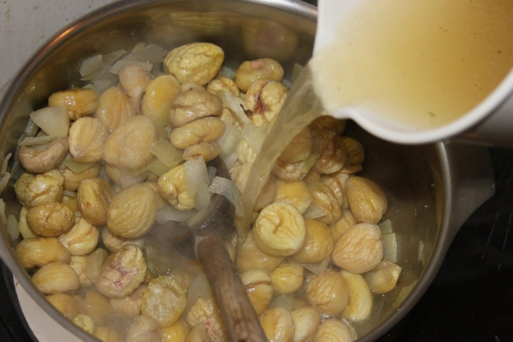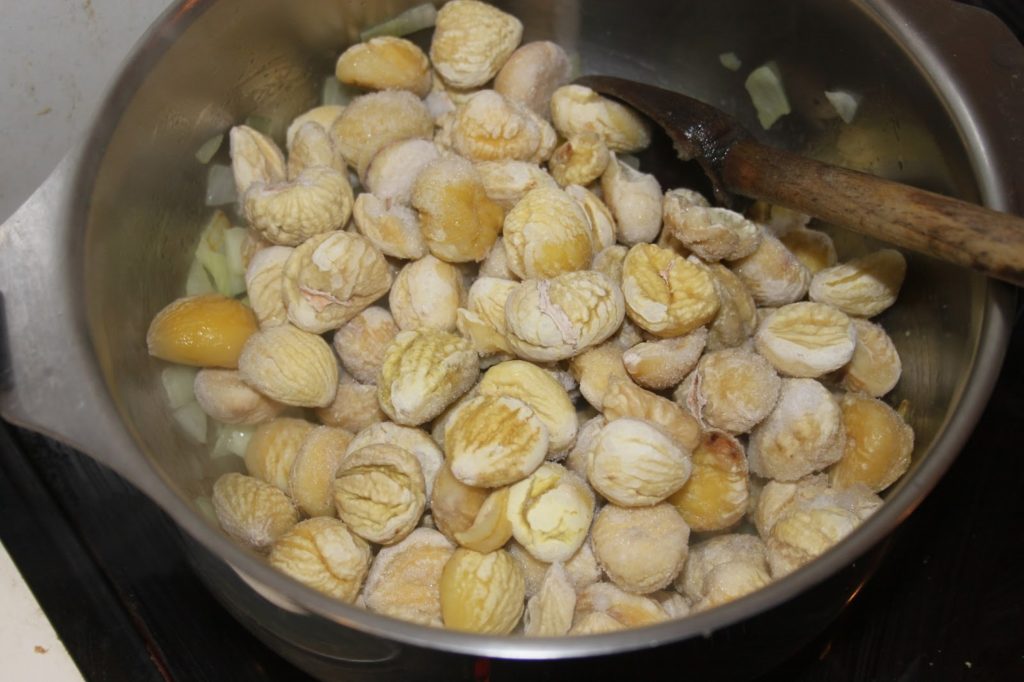 - Laisser cuire 2-3 minutes en remuant puis ajouter les châtaignes. Ici, j’ai pris les châtaignes crues congelées de chez Picard qui sont parfaites. On peut tout à fait prendre des châtaignes cuites en bocaux. La cuisson sera dans ce cas moins longue.