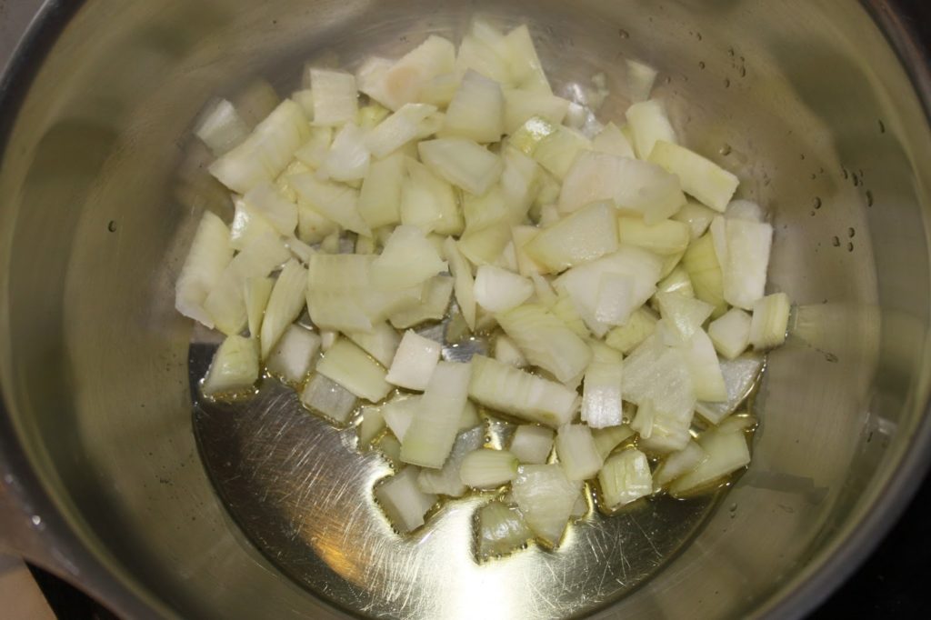- Couper l’oignon en morceaux (peu importe leur forme !). Mettre l’huile d’olive à chauffer dans une grande casserole et ajouter les oignons.
