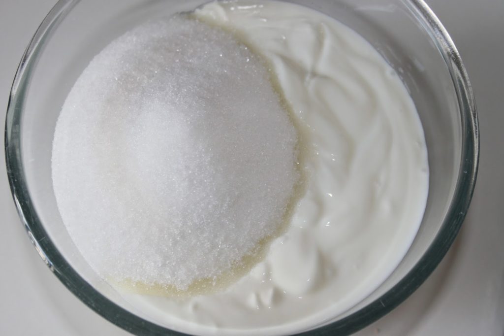 - Mélangez le sucre et le yaourt brassé. Vous pouvez même tout à fait prendre du yaourt 0% brassé.