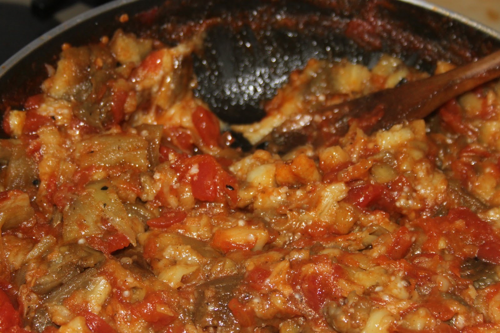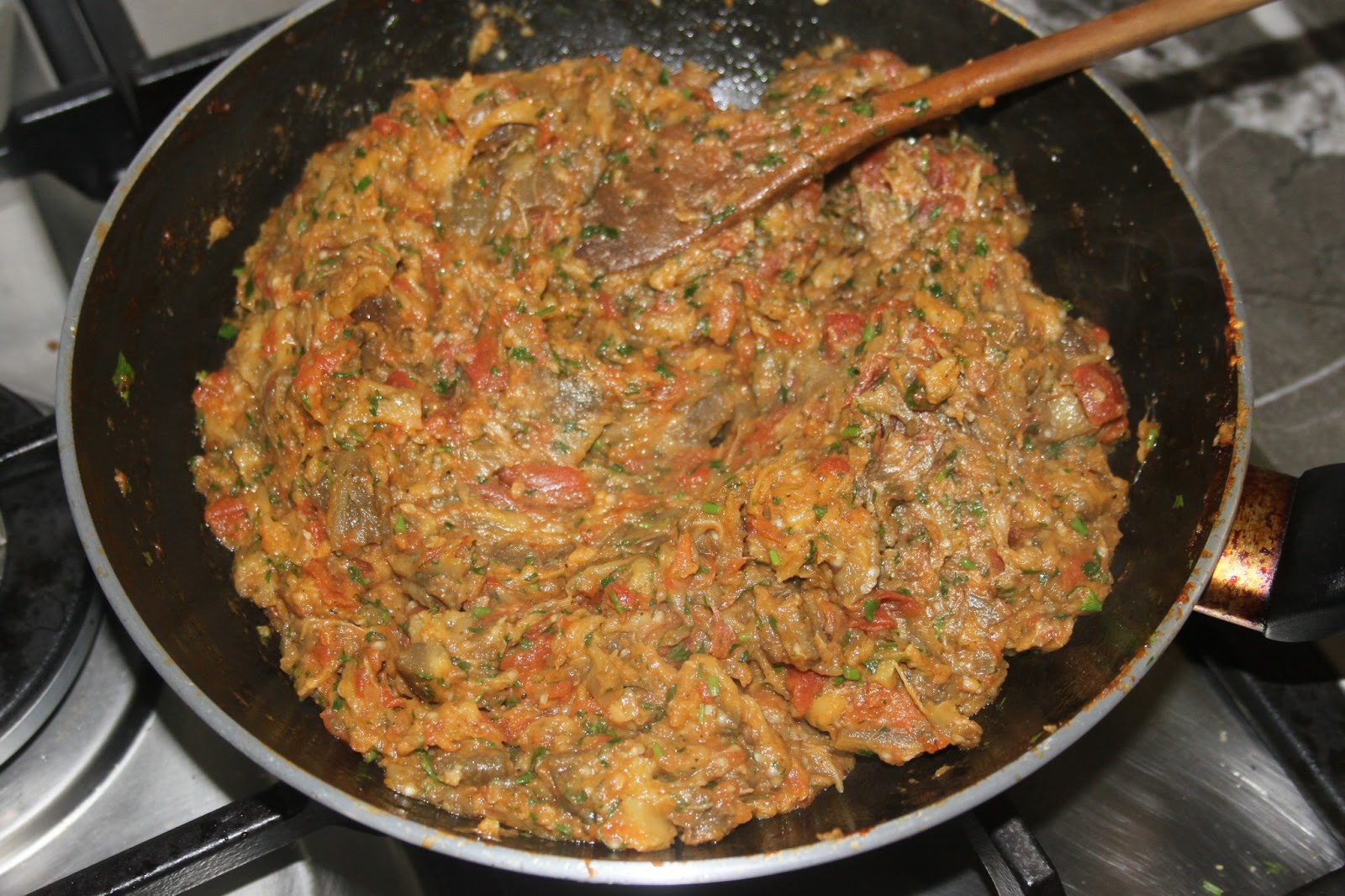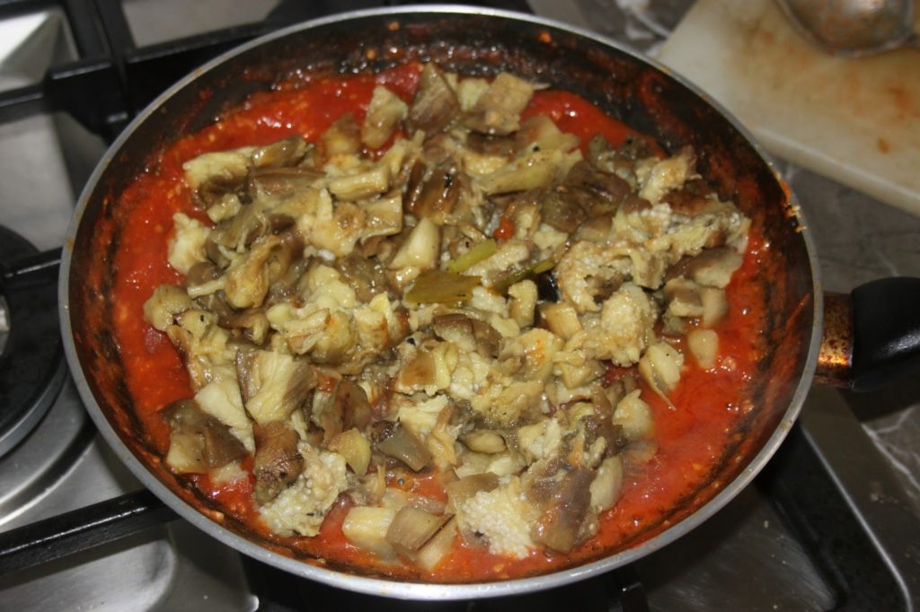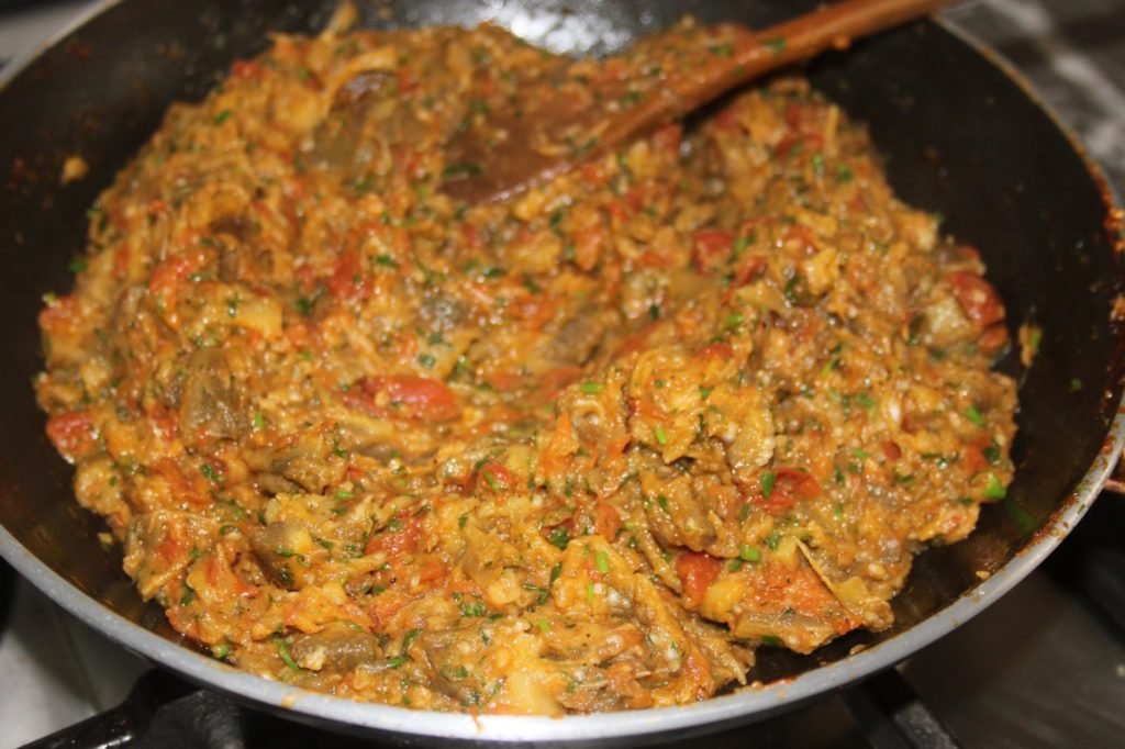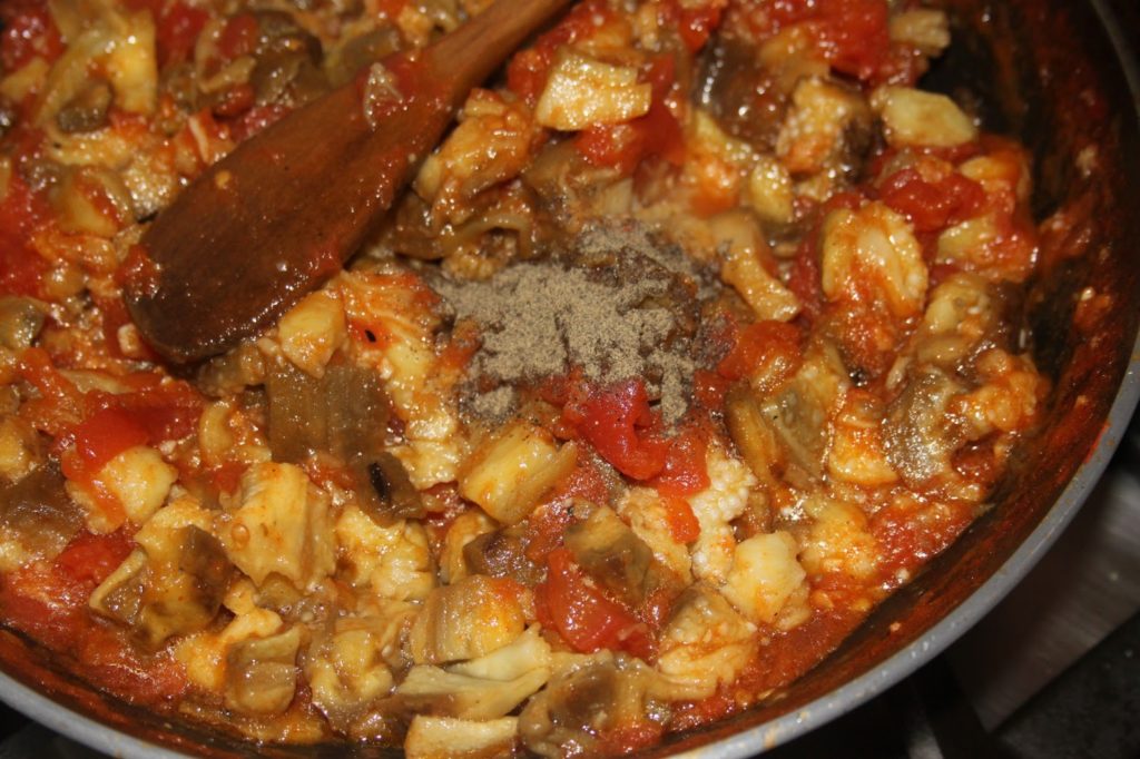 - Laisser ensuite cuire jusqu’à ce que l’eau ne soit plus trop présente, cela doit devenir plus pâteux. Pendant ce temps, mettre une petite grille sur le gaz (même un petit camping gaz fait l’affaire si l’on n’a pas le gaz chez soi) et mettre les aubergines directement au contact de la flamme.