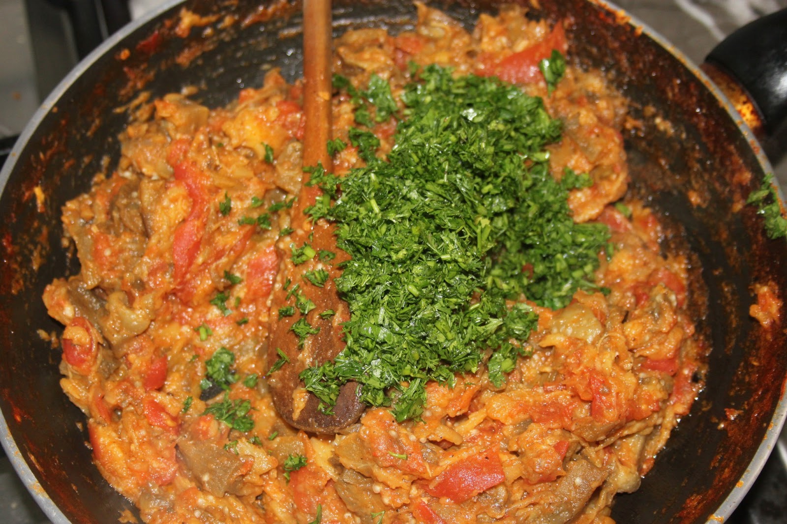 - La masse va s’assécher de plus en plus et change de couleur. Il faut toujours mélanger et laisser cuire pour obtenir un zaâlouk qui ne rend pas du tout d’eau.