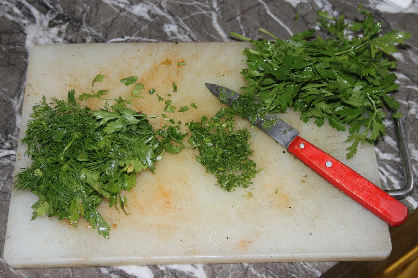 - Hacher le petit bouquet de coriandre et de persil plat, puis ajouter le tout dans la poêle.