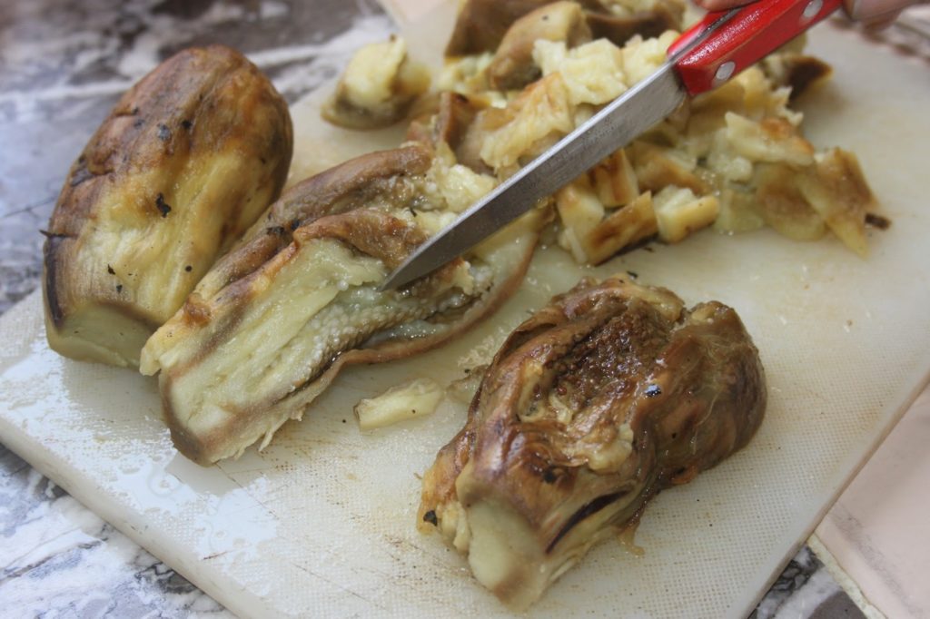 - Laisser reposer 20 minutes. La vapeur des aubergines va continuer à les cuire. Éplucher ensuite la peau grillée avec un petit couteau en raclant bien toutes les parties noires.