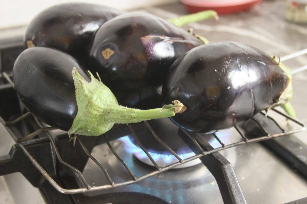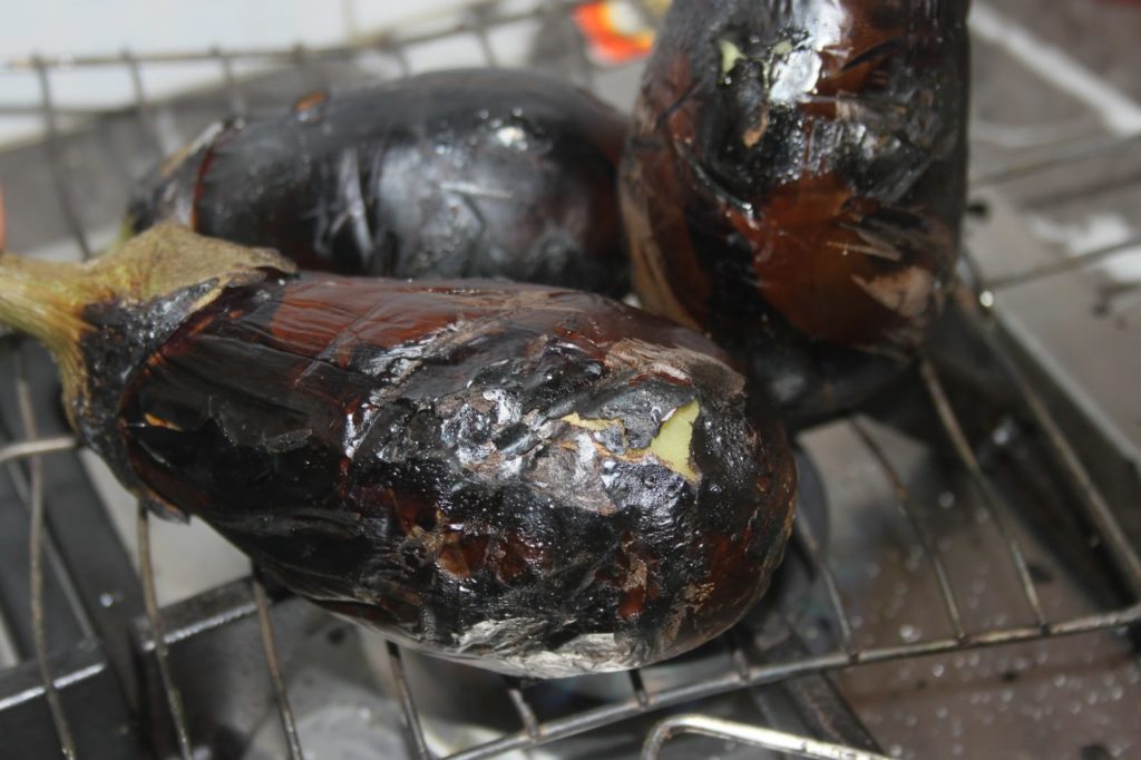 - Les retourner régulièrement pour brûler la peau. Cela prend du temps, 15 minutes en tout, car il faut brûler la peau de tous les côtés. Note de Bernard: pour obtenir le goût fumé caractéristique de ce plat, il faut brûler la peau des aubergines. Mais on peut aussi les mettre au four près du grill à la chaleur maximum en les retournant également régulièrement. Le goût ne sera pas tout à fait le même, mais sera tout de même très bon !