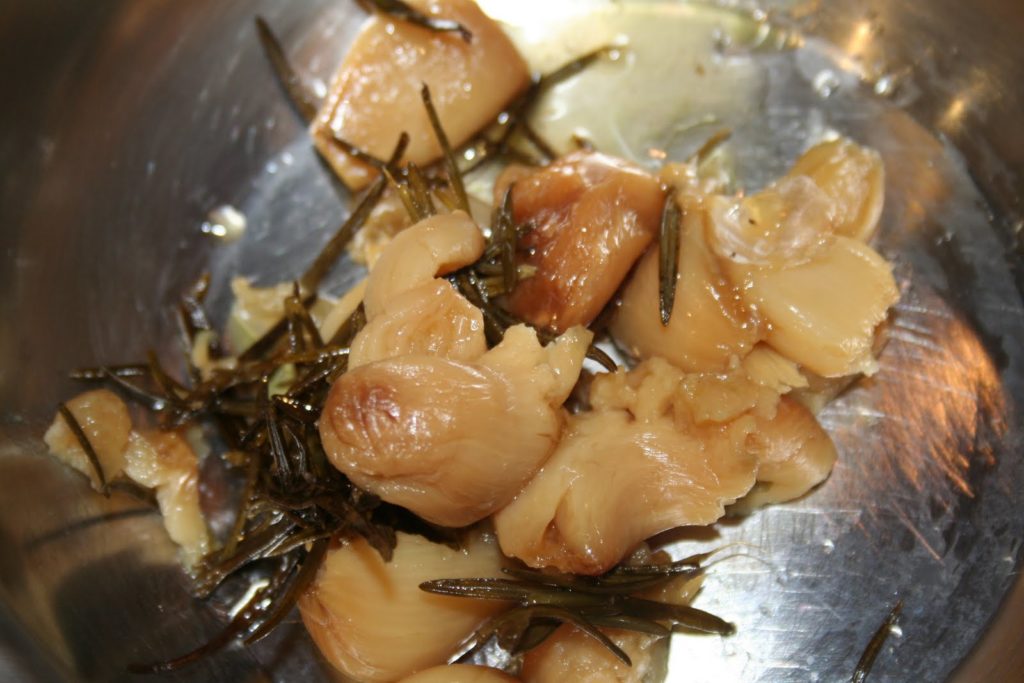 - Récupérer la chaire de cette tête d’ail (donc sans peau) avec les feuilles de romarin et mettre dans une casserole.