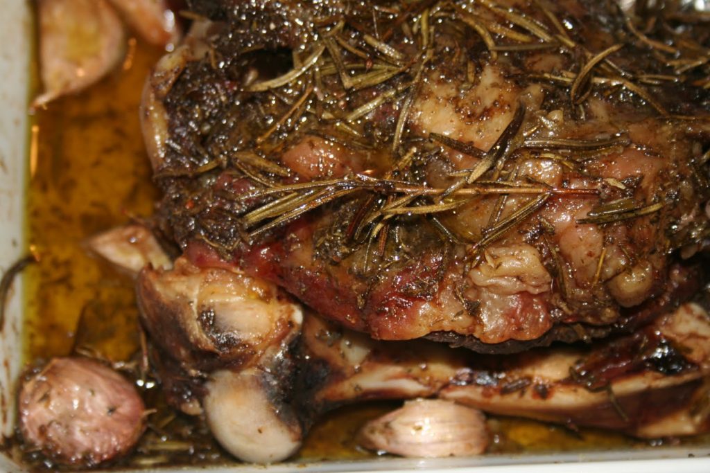 Mettre l’épaule (j’ai mis les os sous la viande pour qu’ils prourent plus de goût) dans un plat allant au four avec les gousses d’une tête d’ail, avec leurs peaux. Récupérer les feuilles d’une autre branche de romarin et disperser dans le plat.