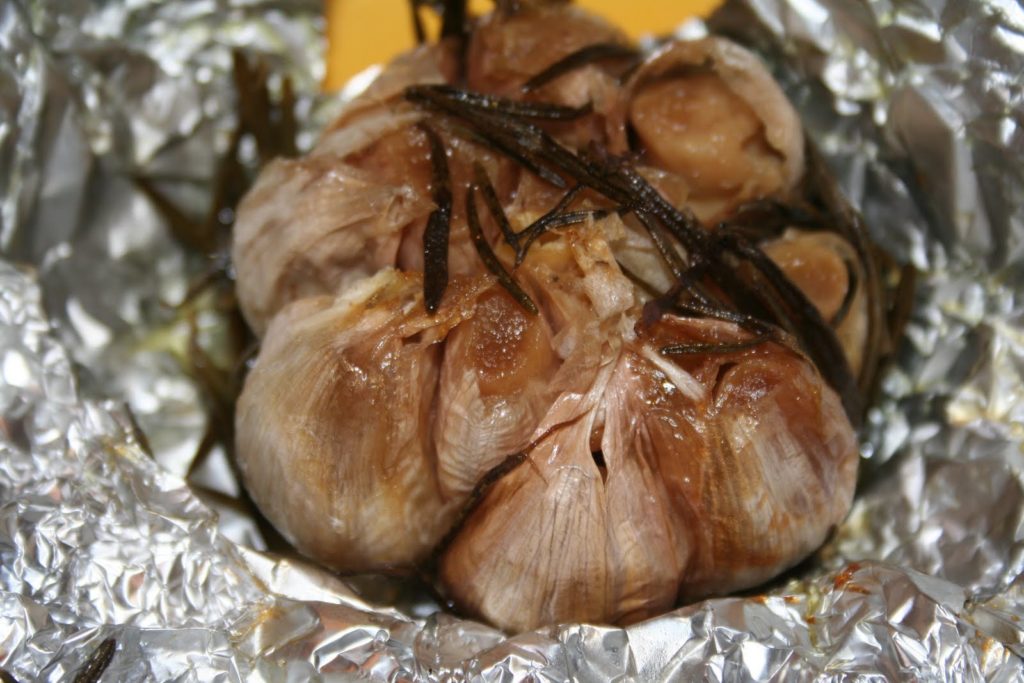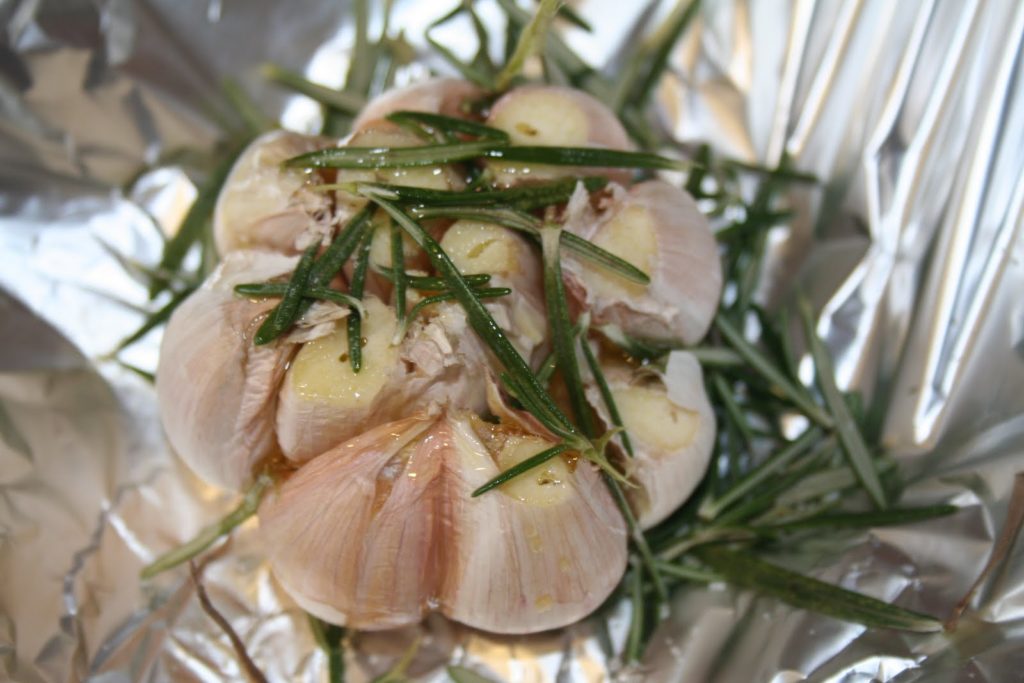 Couper juste le dessus de la deuxième tête d’ail. Mettre la deuxième tête d’ail entière dans un papier d’aluminium avec des feuilles de romarin (toujours lavées), une cuillerée à soupe d’huile d’olive et du sel. Fermer en papillote.