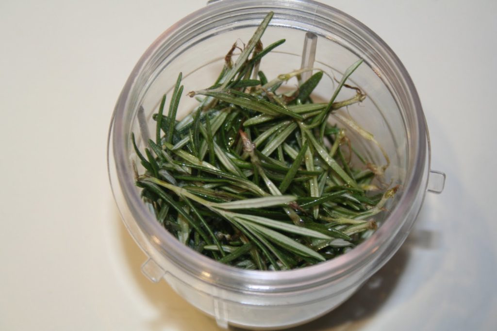 - Dans un petit mixeur, mettre les feuilles de 2 ou 3 branches de romarin (passées à l’eau), du sel et une bonne cuillerée à soupe d’huile d’olive.