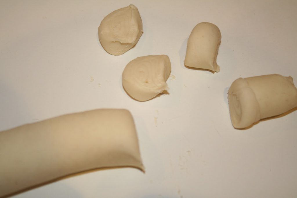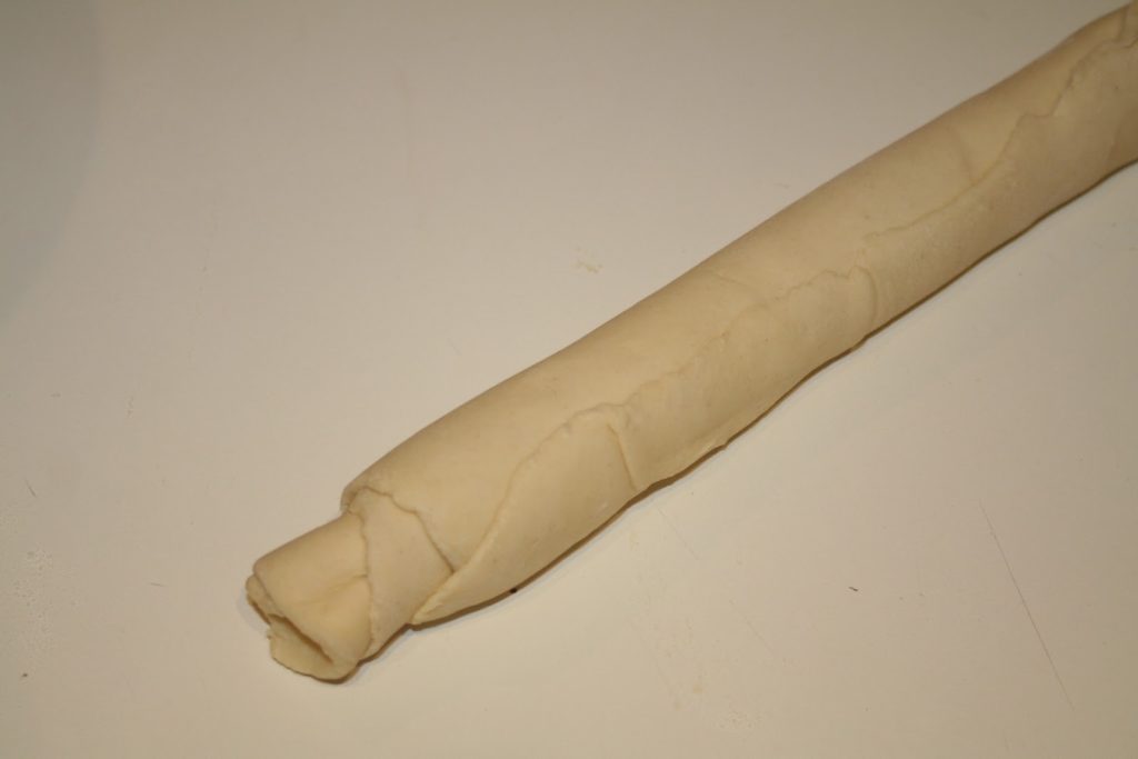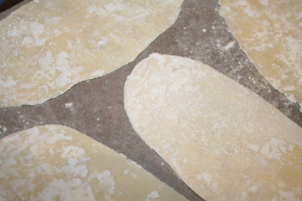 - On peut voir la différence de taille entre les petits morceaux et la taille de l’arlette! Si l’on souhaite de petites arlettes, il faut couper plus finement le boudin de pâte feuilletée.
