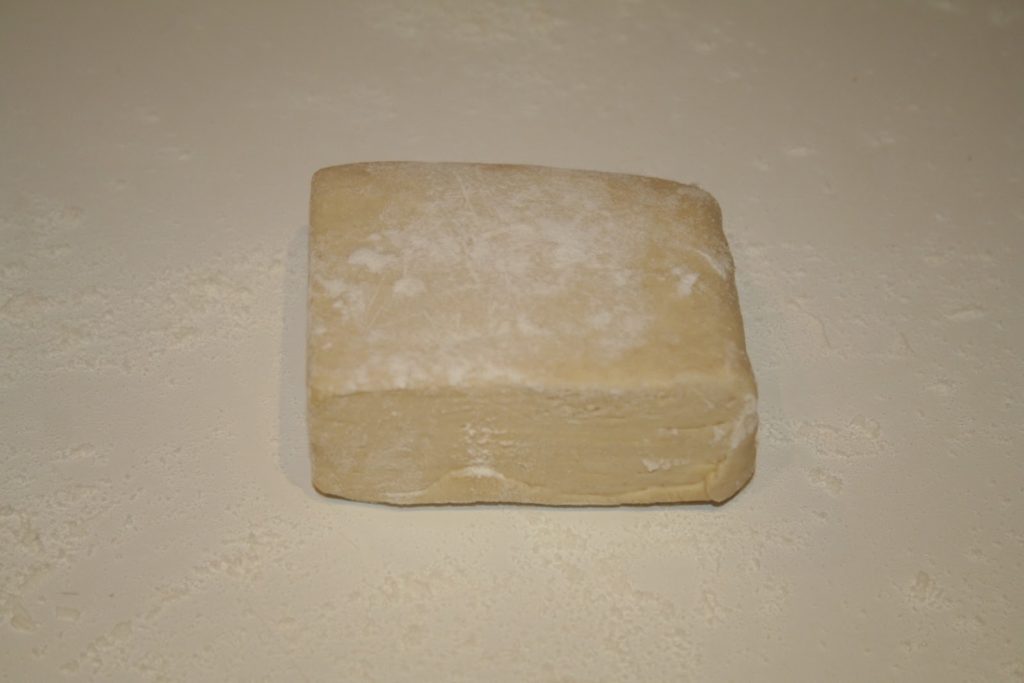 - Fariner légèrement le plan de travail sans excès. Mettre un pâton de pâte feuilletée en carré.