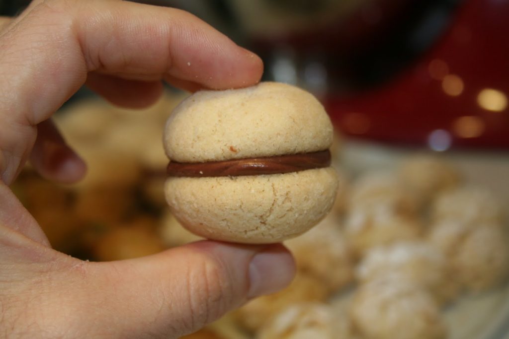 - Quand les gâteaux sont refroidis, les garnir d’une cuillerée à café de gianduja quand celui-ci commence à se raffermir. Attention, le gianduja a une phase de solidification très rapide. En quelques minutes il passe du liquide à une pâte assez dure! Ce que je fais, c’est mettre le gianduja dans une mini poche à douille et dès que je sens que le gianduja est assez malléable, je garnis en vitesse les baci di dama comme des macarons.