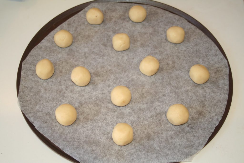 Former des boulettes égales et les placer sur une plaque à pâtisserie garnie de papier sulfurisé. J’ai pesé mes boulettes de façon à ce qu’elles aient toutes le même poids (14g).