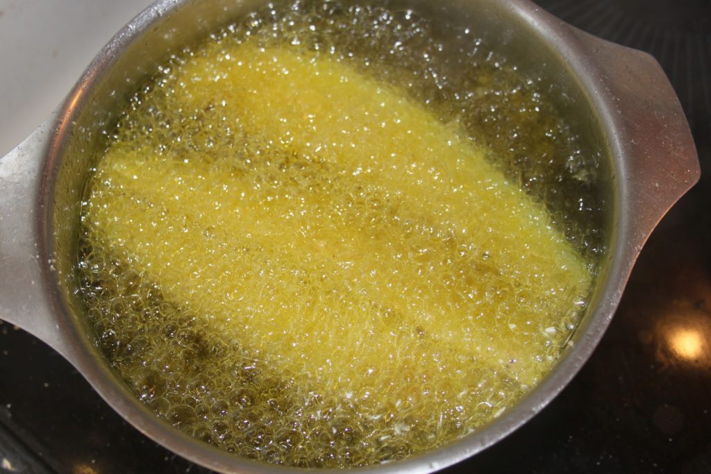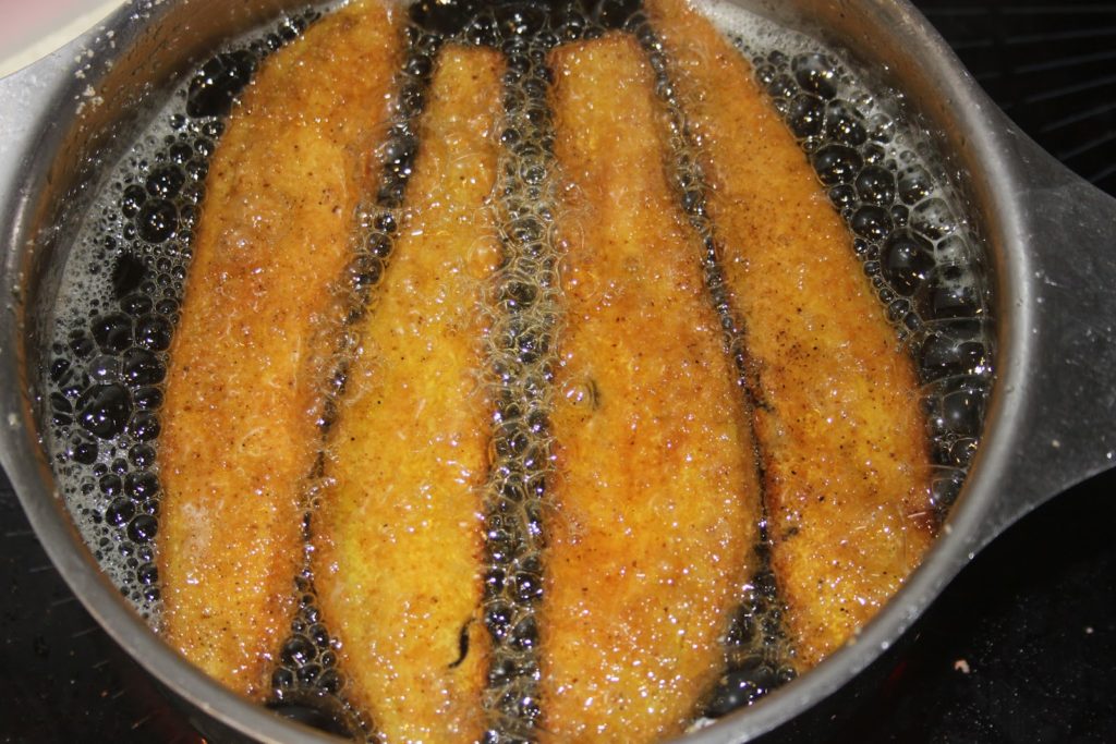 - Chauffer la casserole d’huile d’olive. Quand l’huile est bien chaude, mettre quelques tranches d’aubergines panées.