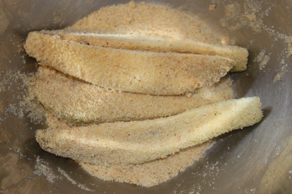 - Puis mettre 4 tranches d’aubergines sur la chapelure. Bien secouer pour répartir celle-ci.