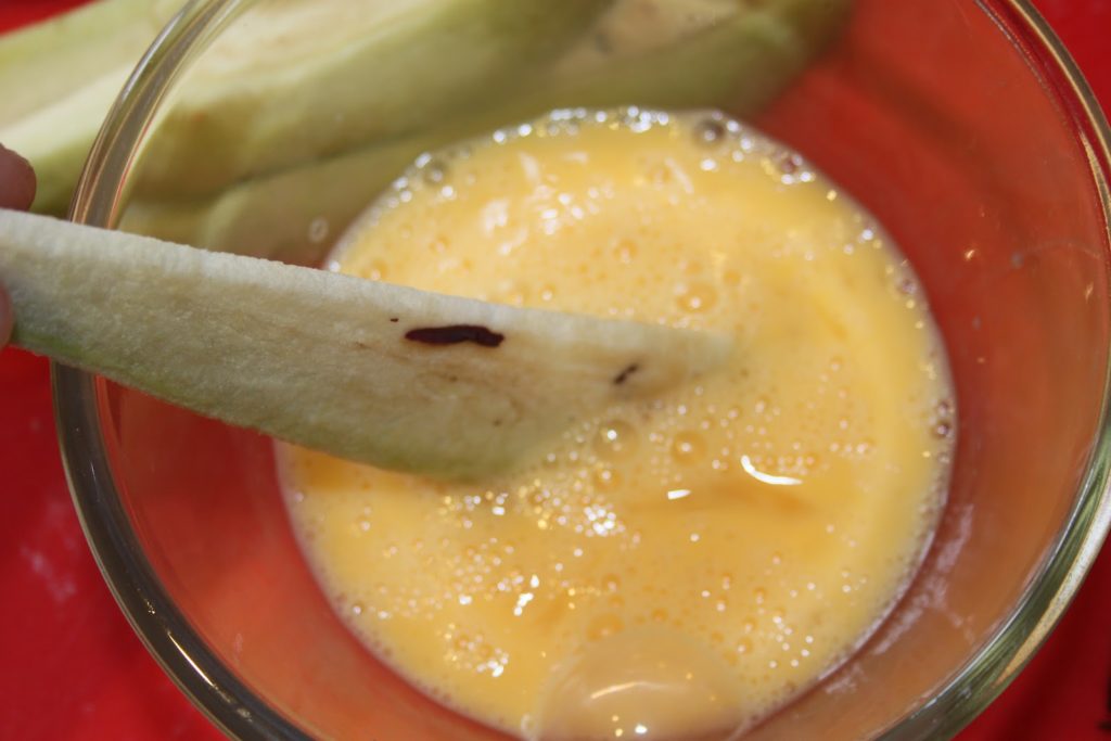 - Battre un ou deux oeufs puis plonger les tranches d’aubergines dedans.