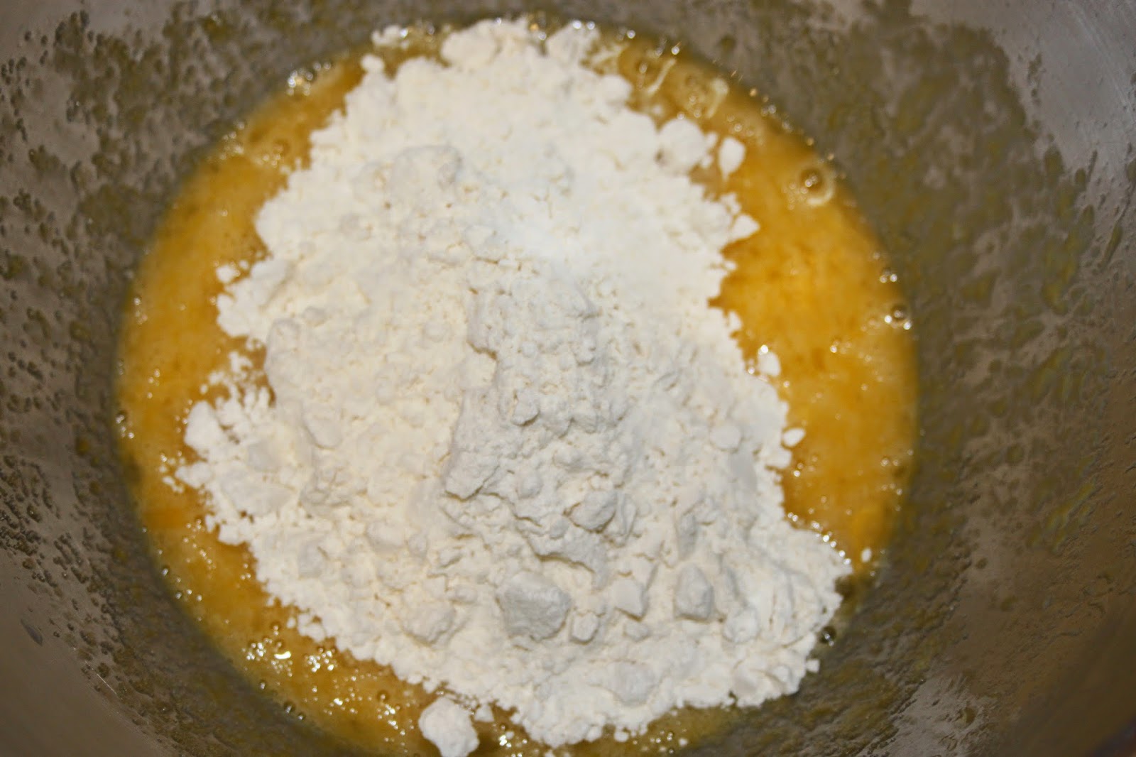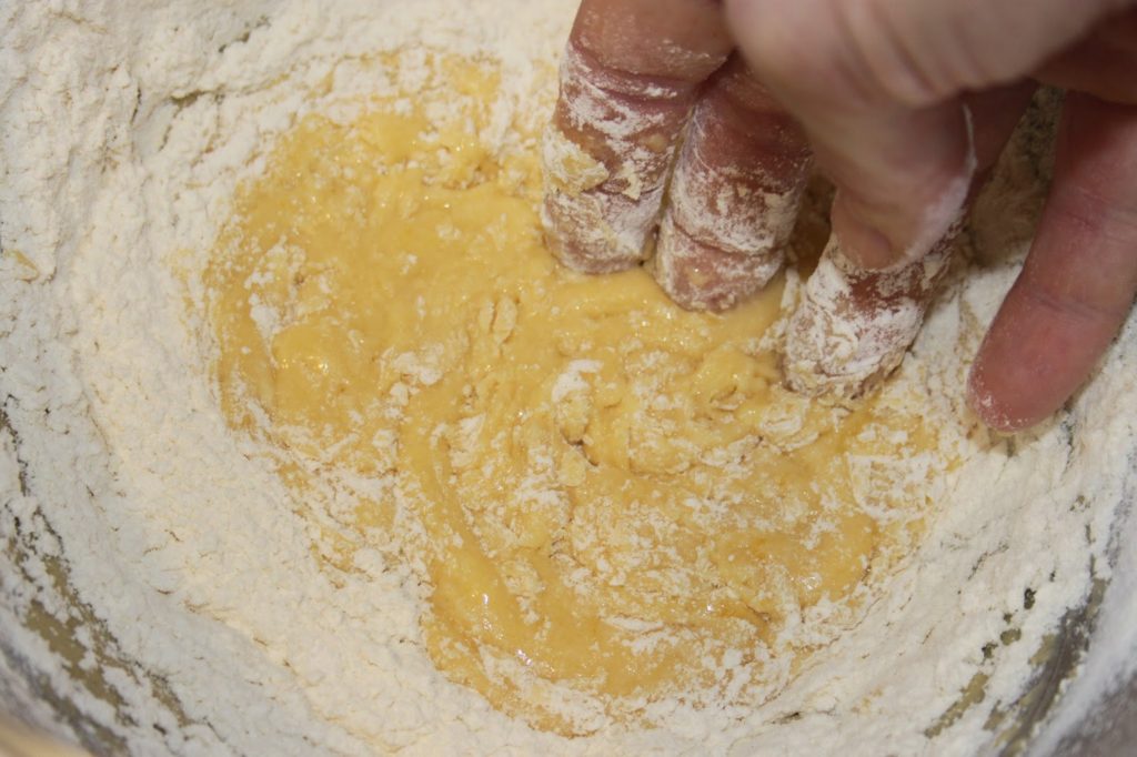 Puis versez enfin la farine. Ajoutez-la petit à petit pour sentir de combien la pâte a besoin. Cela doit avoir la consistance d’une pâte à pain.