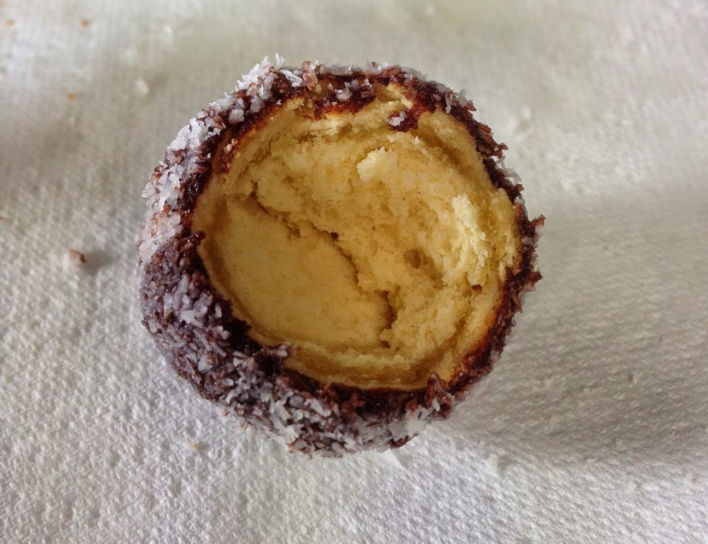 Au Brésil, dans les familles principalement, plus rarement en vente dans la rue, se trouve cette recette de « beijos de mulata », littéralement les bisous de la métisse. « Mulata » désigne une jeune fille métissée et plus généralement une belle fille en portugais du Brésil. C’est grâce à leur couleur dorée à la sortie de la friture et aussi au bain chocolaté que ces petites douceurs doivent leur nom. Une recette toute simple qui change de nos bons vieux pets de nonne (moins glamour dans le nom il faut bien l’avouer, mais que j’aime aussi…). Il s’agit donc de petits beignets trempés dans une sauce épaisse au chocolat puis roulés dans de la noix de coco. Au Brésil, la noix de coco séchée et plus épaisse que la notre mais cela ne change pas vraiment quoique ce soit au goût !