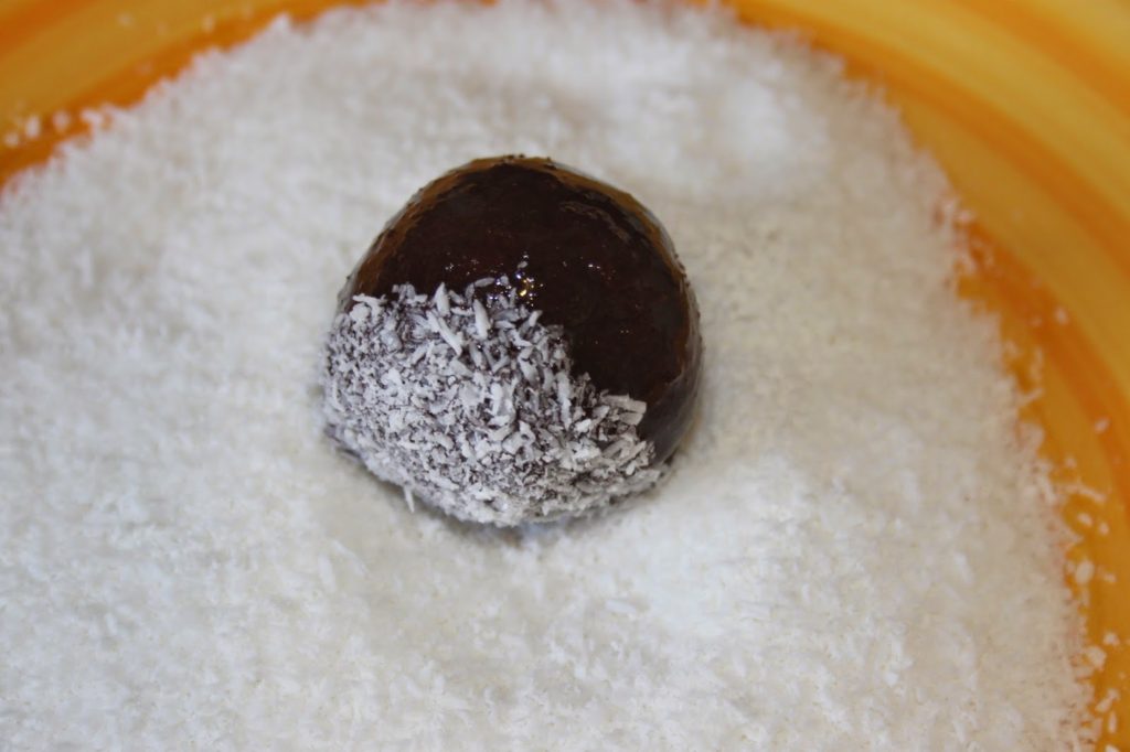 Puis roulez-les dans la noix de coco. Il faut savoir qu’au Brésil on trouve de la noix de coco beaucoup plus épaisse que celle que l’on a chez nous. Mais cela marche tout aussi bien avec la notre !