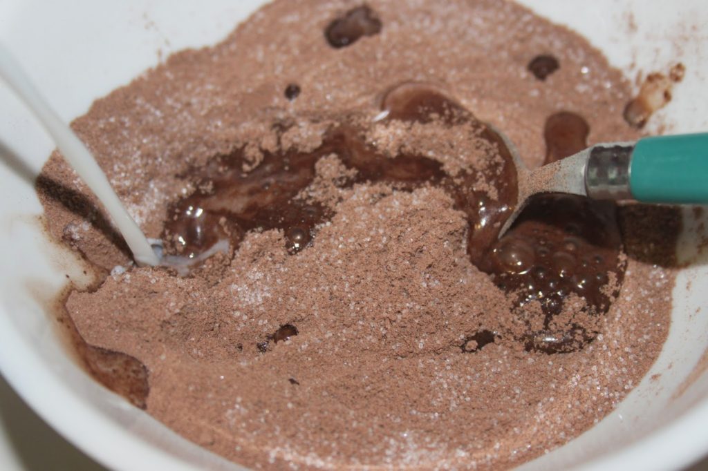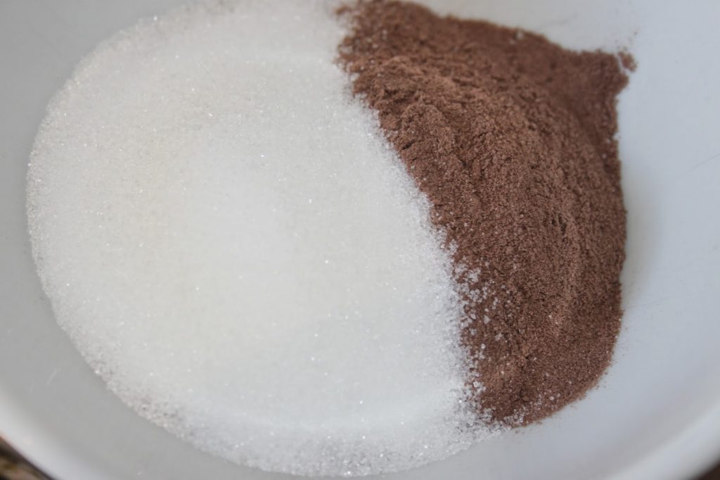 Pour la sauce, mélangez le chocolat en poudre et le sucre.