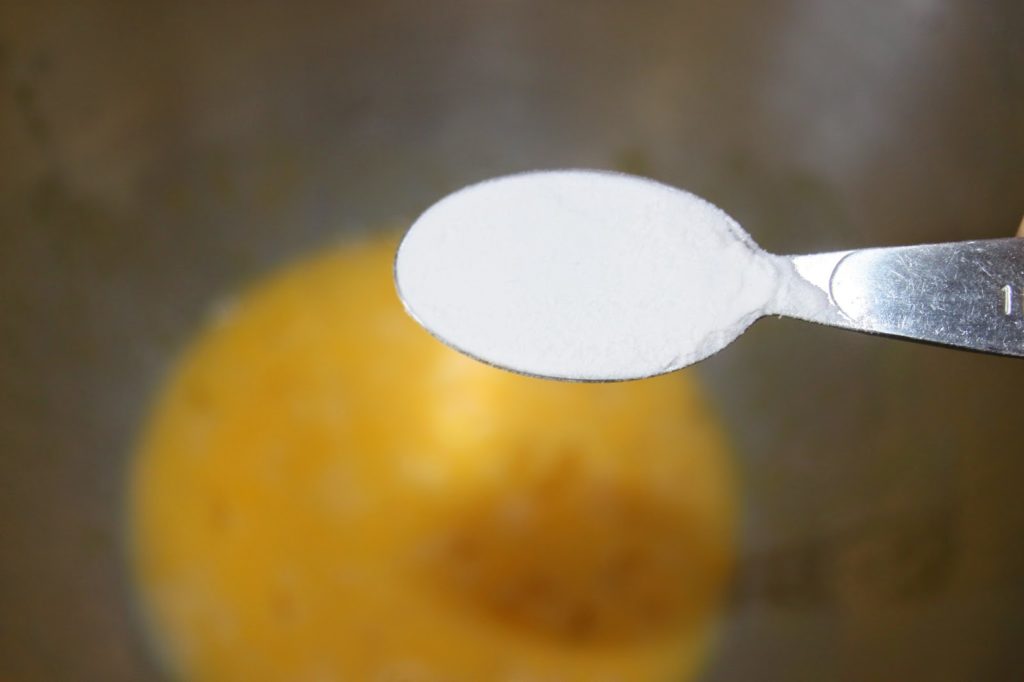 La levure chimique. Je mets une cuillerée à café à raz. Toujours avec mes cuillères américaines.