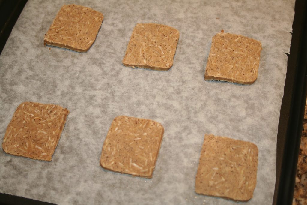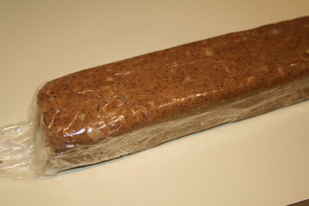 - Laisser reposer au frais pendant au moins 2 heures ou jusqu’à ce que la pâte soit dure.Préchauffer le four à 180°C. Couper de fines tranches dans la pâte.