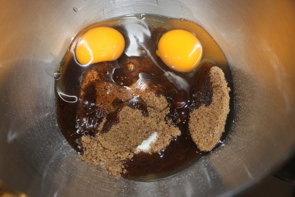 - Mélangez le sucre semoule, la vergeoise , la vanille liquide et les œufs.