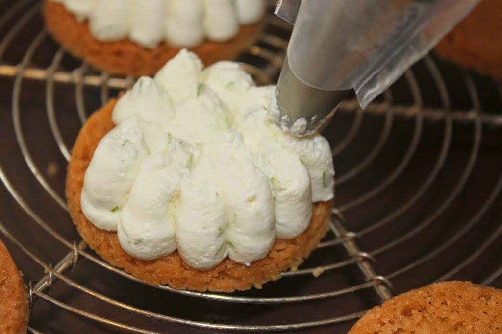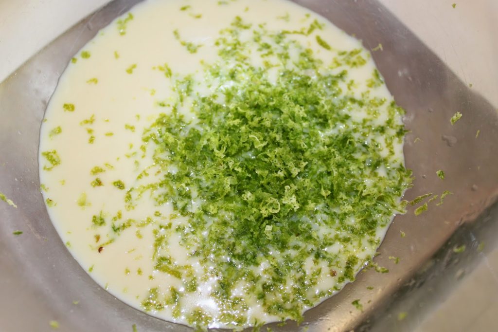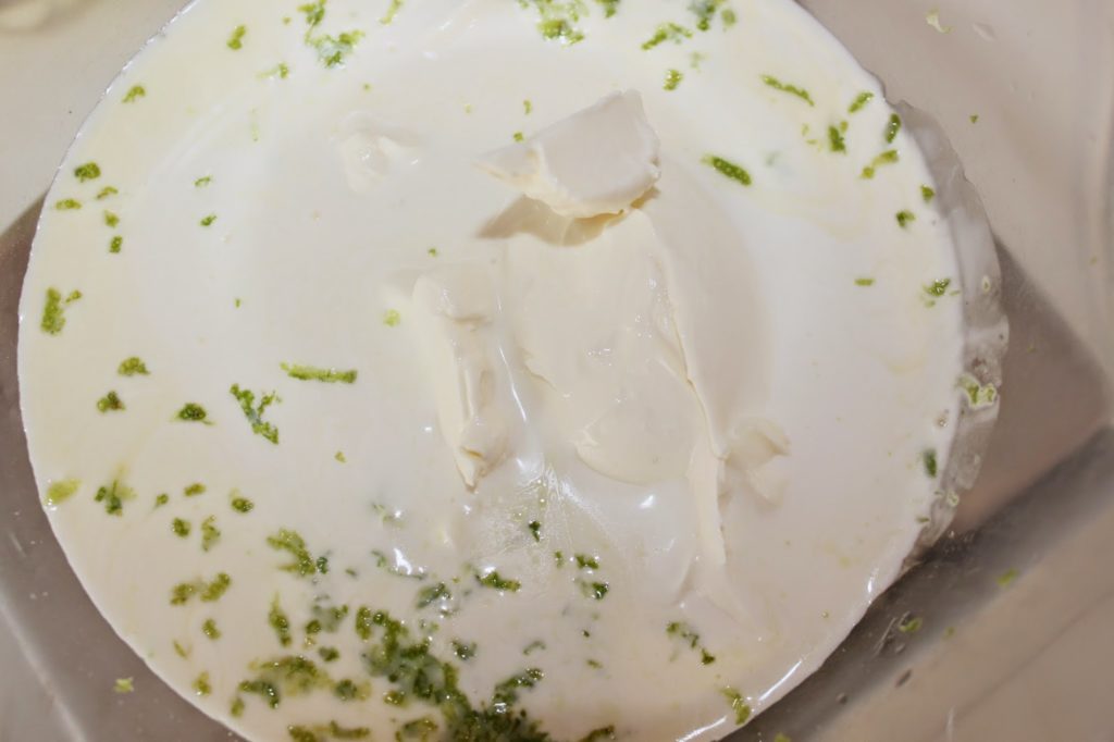- Dans la « pseudo ganache » bien froide au chocolat blanc, ajoutez le zeste de citron vert.