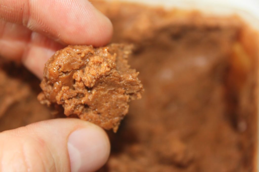 - Laissez prendre au frais puis prélevez des petites billes de praliné. J’ai une mini cuillère à glace, mais vous pouvez prendre des petites billes à la main.