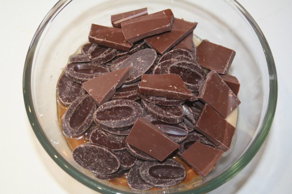 - Faites fondre le chocolat noir et le chocolat au lait au micro-ondes ou bain-marie.