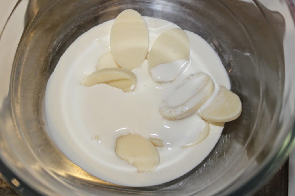 - Anticipez la crème fouettée en faisant fondre le chocolat blanc (couverture ivoire) avec la crème au four à micro-ondes ou sur feu modéré dans une petite casserole. Mélangez bien pour avoir un crème lisse et uniforme puis laissez ensuite cette « pseudo ganache » au frais jusqu’à utilisation. On la montera en chantilly plus tard !