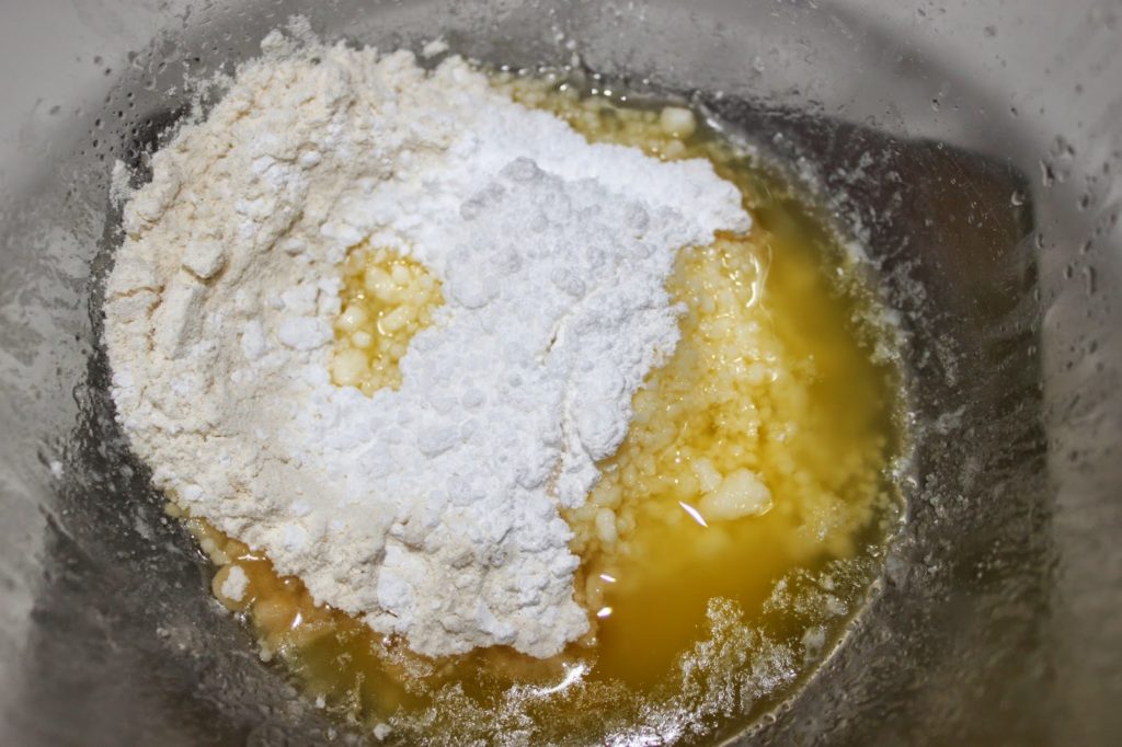 - Préparez tout d’abord les disques de pâte. Mettez le beurre fondu, le sucre glace, le sel et la farine dans un petit récipient.