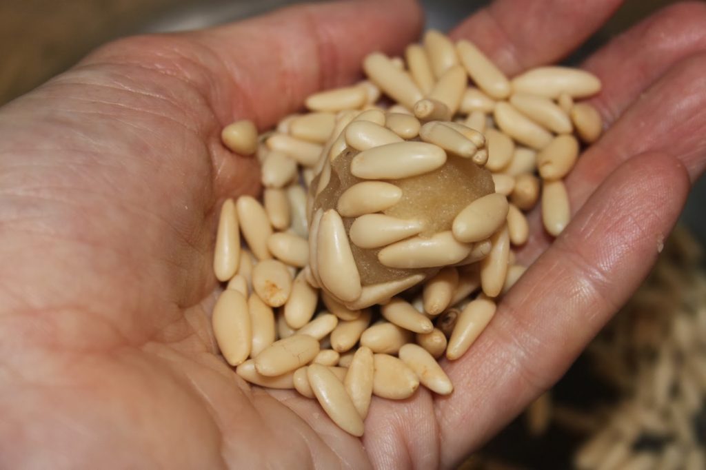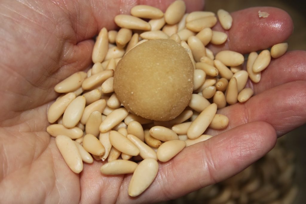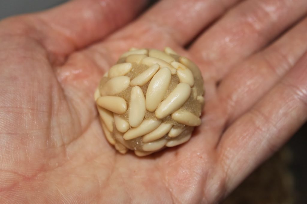 - Prenez une bonne poignée de pignons de pin et placez une boulette de pâte dessus.