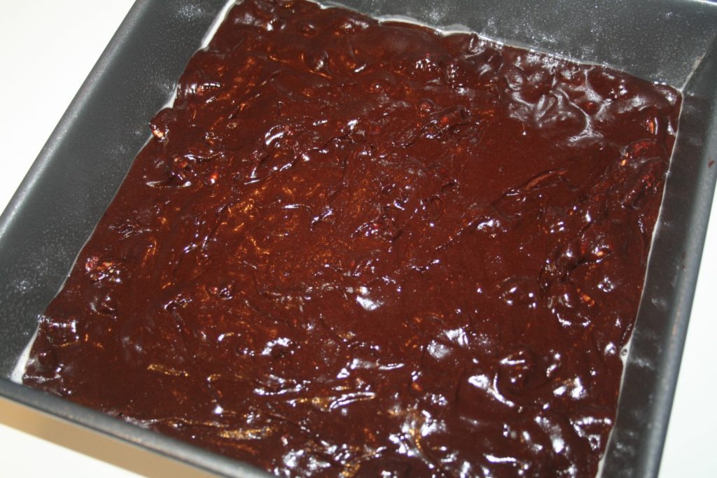 - Verser la pâte dans un moule carré de 21 sur 21 garni de papier sulfurisé. Je vaporise également de la bombe de démoulage anti-adhérente.